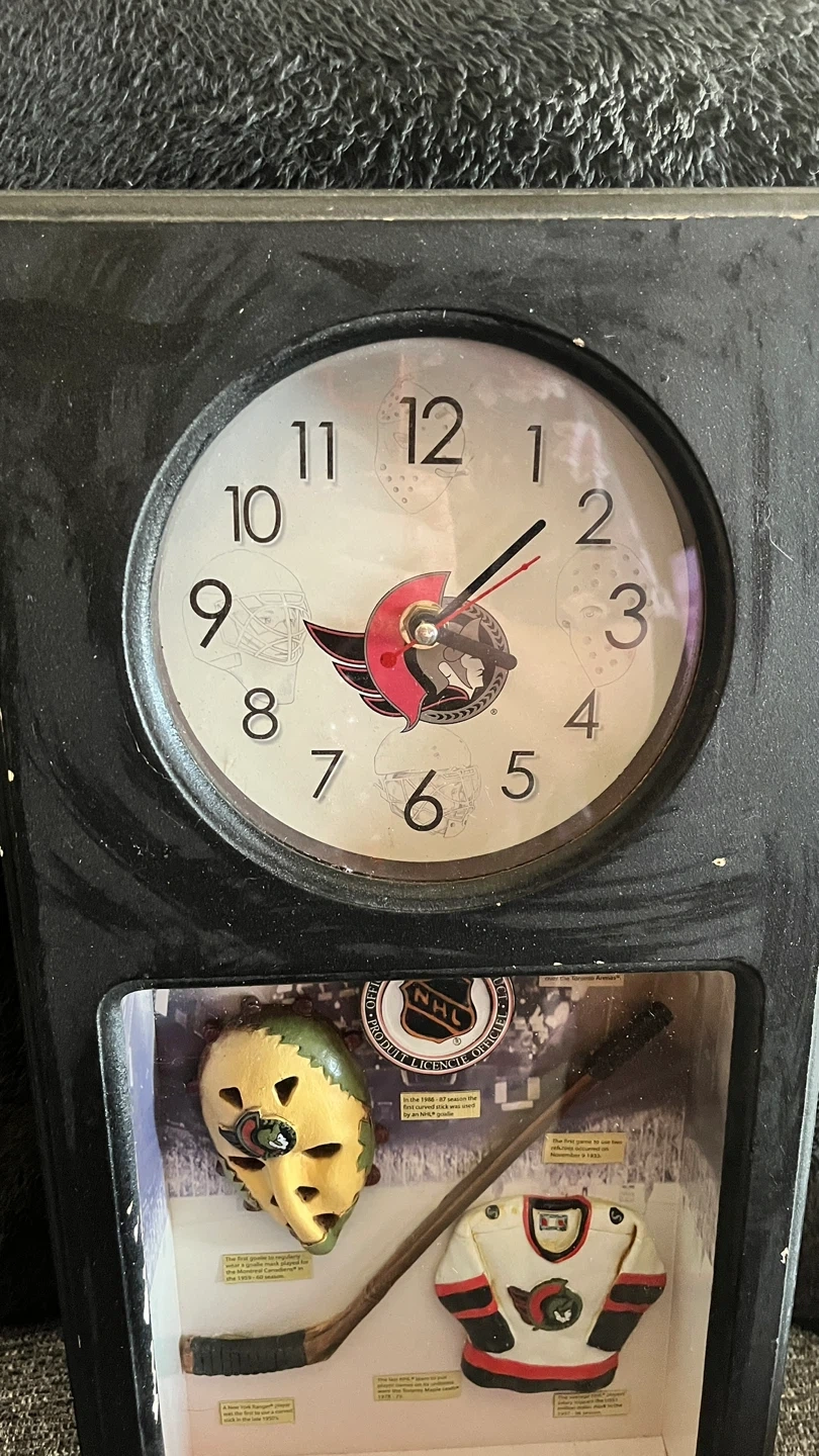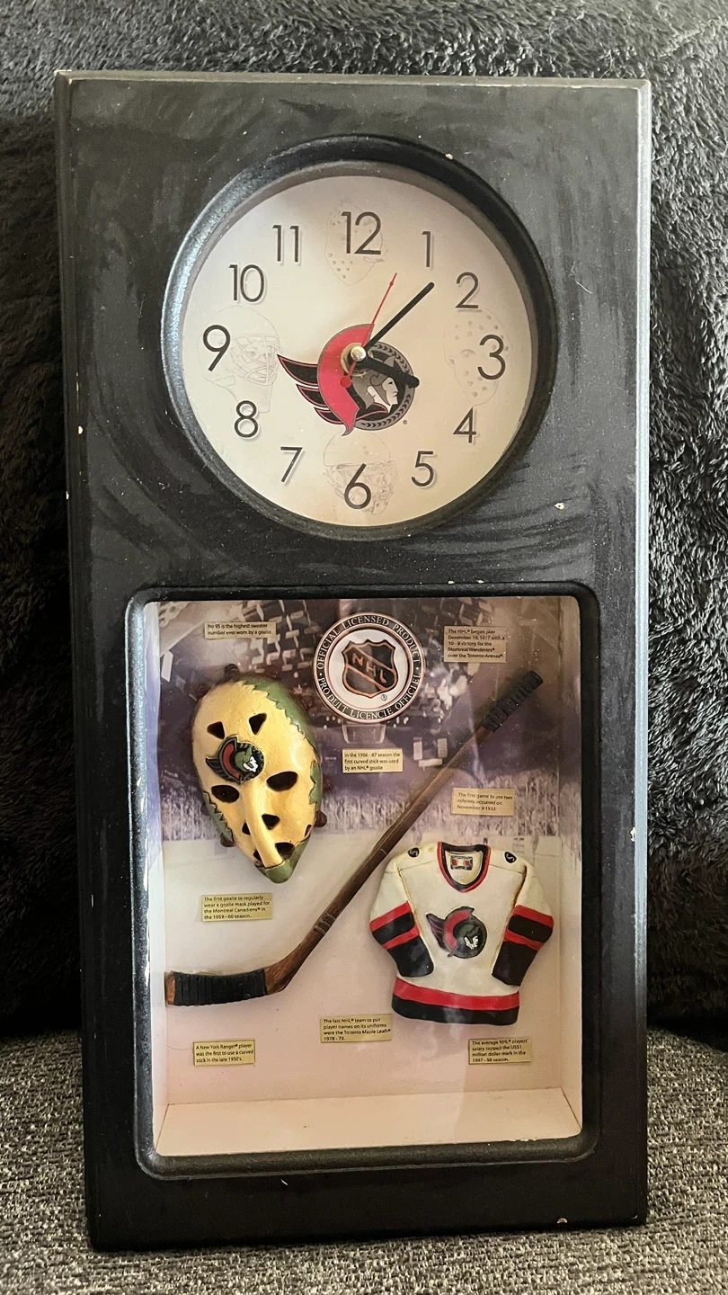 Selling an Ottawa Senators NHL clock. It features a clock face with the team logo and a display case below showcasing a miniature goalie mask, hockey stick, and jersey. Great for any hockey fan!