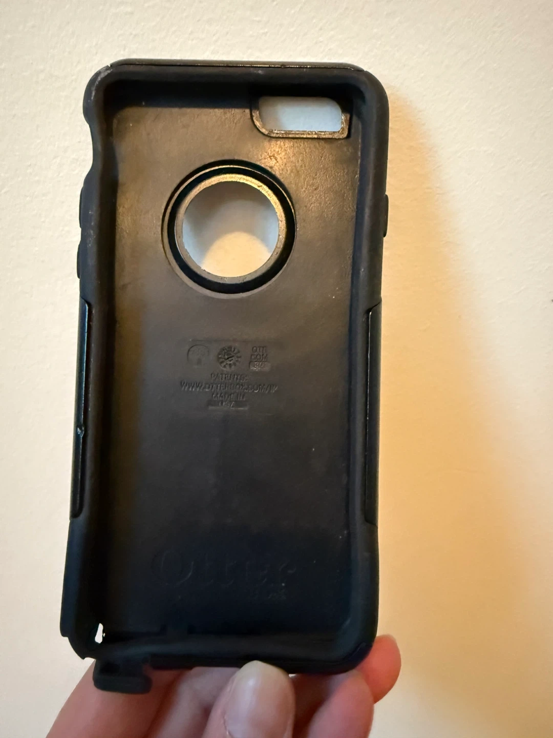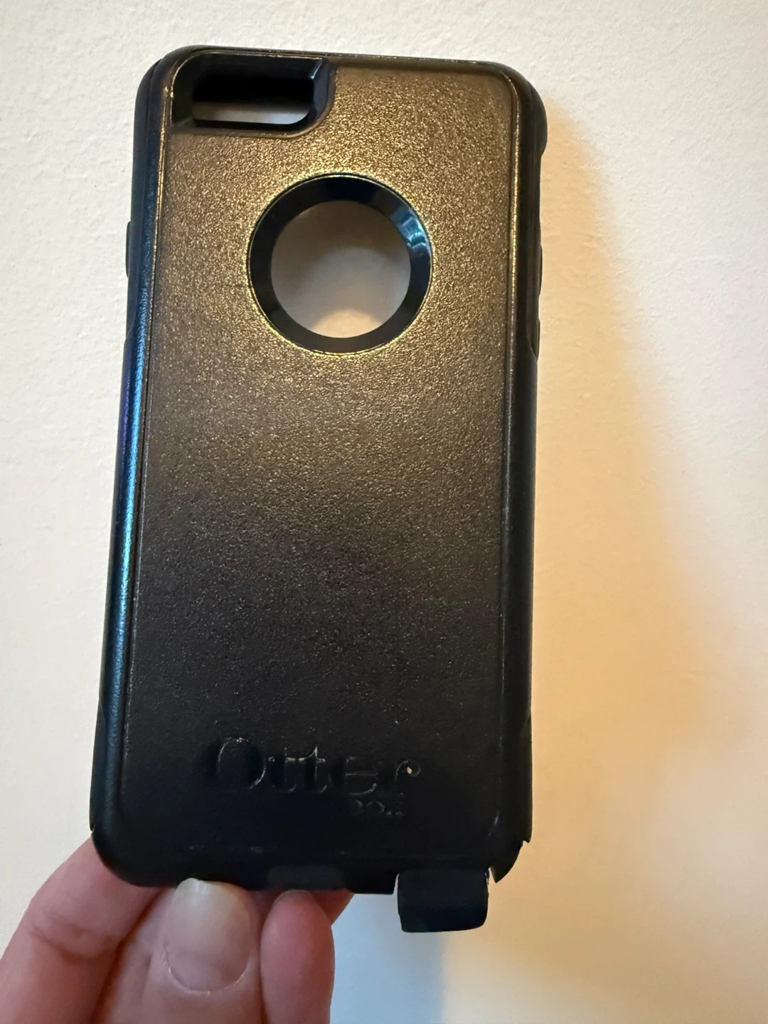 Selling an OtterBox phone case for an iPhone 7 or 8. It's black and has a circular cutout for the Apple logo on the back. Great for protecting your phone!