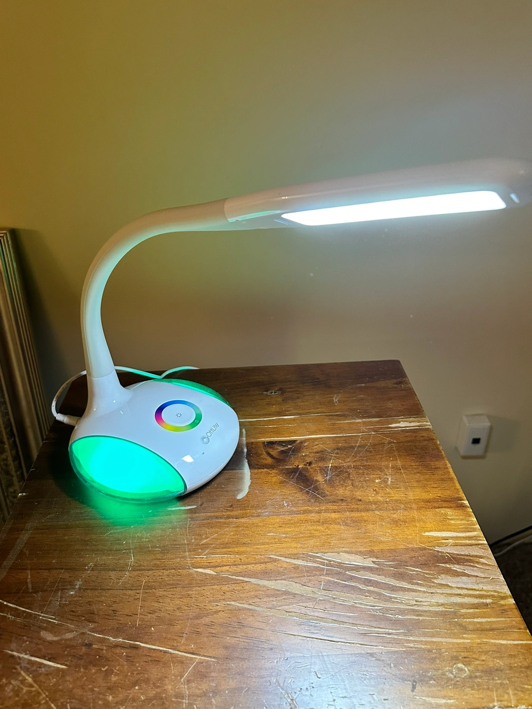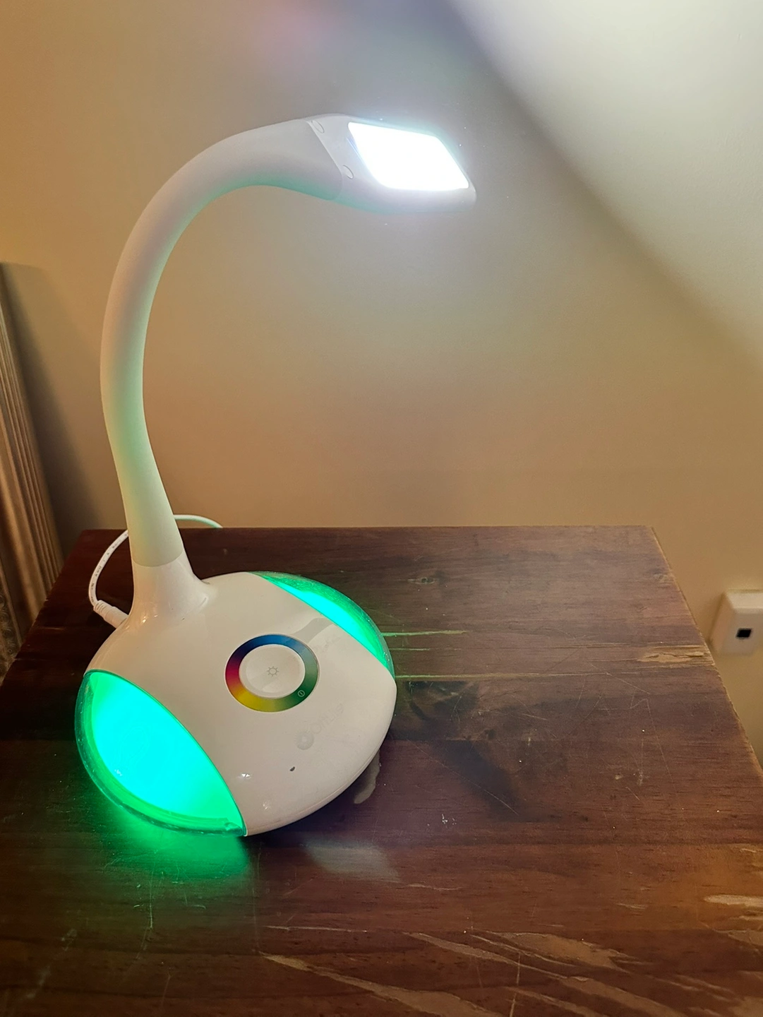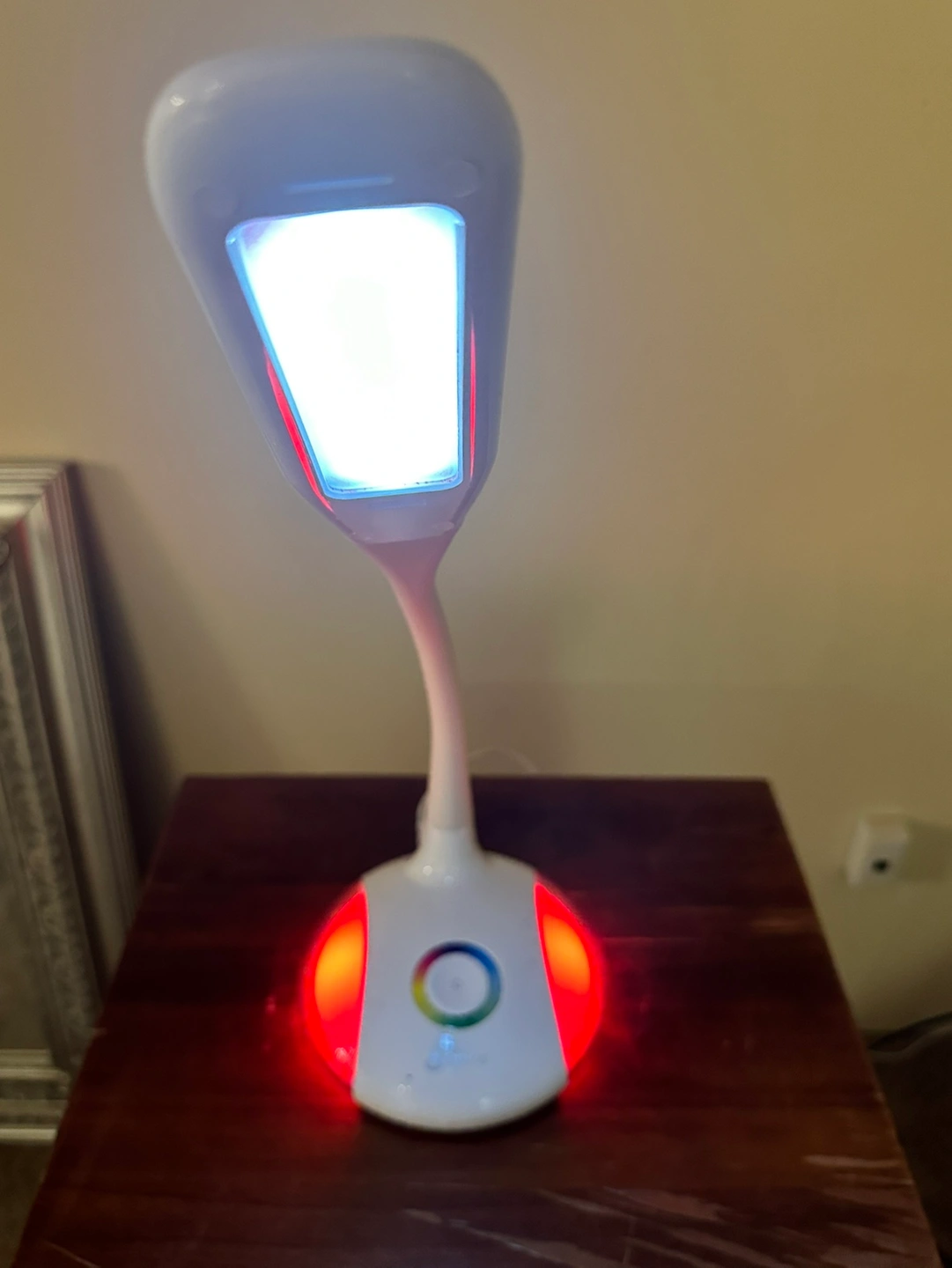 A flexible desk lamp with multiple light colour options and adjustable brightness.