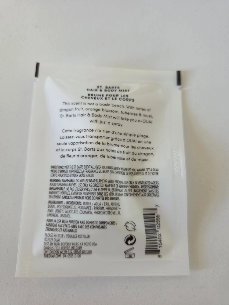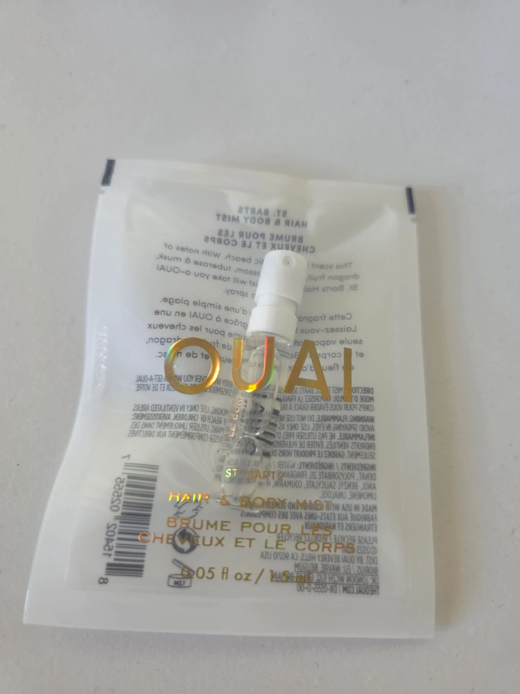 Selling a sample size of OUAI's St. Barts Hair & Body Mist! It's a perfect way to try out the scent. This scent is not a basic beach, with notes of dragon fruit, orange blossom, and tuberose. The sample size is .05 fl oz/1.5 mL