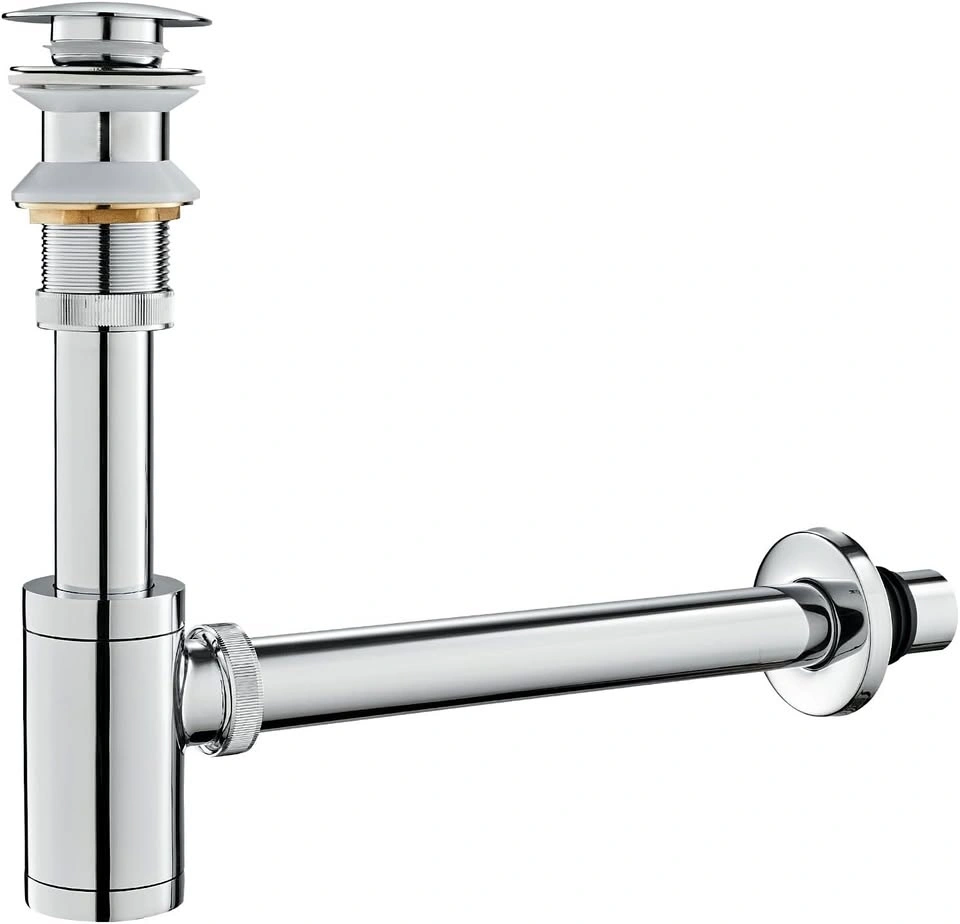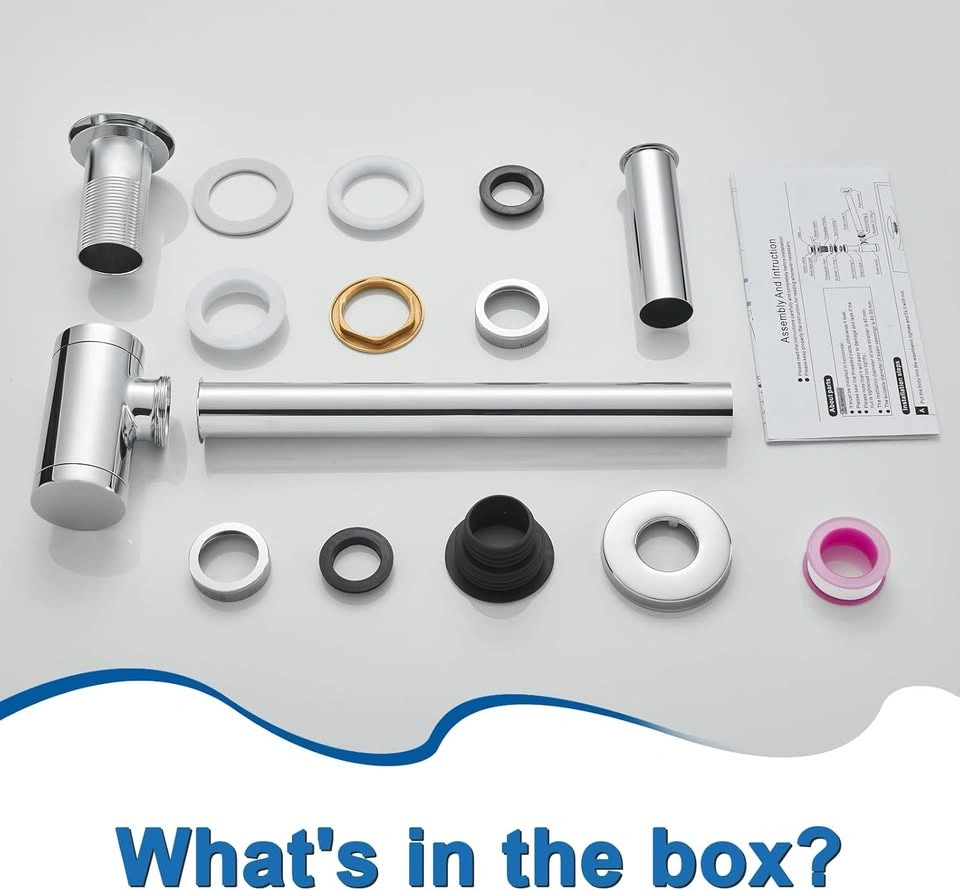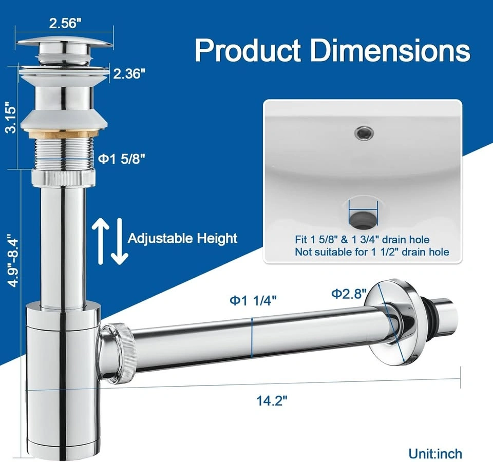 OUGOO Bathroom Basin Sink Waste P-Trap Drain Kit, Adjustable Bottle Trap with Pop Up Drain Stopper Without Overflow Specification ① Finish: Chrome ② Material: Brass & Stainless Steel ③ Drain Hole Fitting: 1 5/8" or 1 3/4" drain opening ④ Length of the Wall Mounted Horizental Outlet Pipe: 11 4/5" inch (can be cut to fit different lengths) ⑤ The diameter of Slip Inlet Pipe: Standard 1 1/4" ⑥ Height Adjustable Bottle trap: 4.9"-8.4"