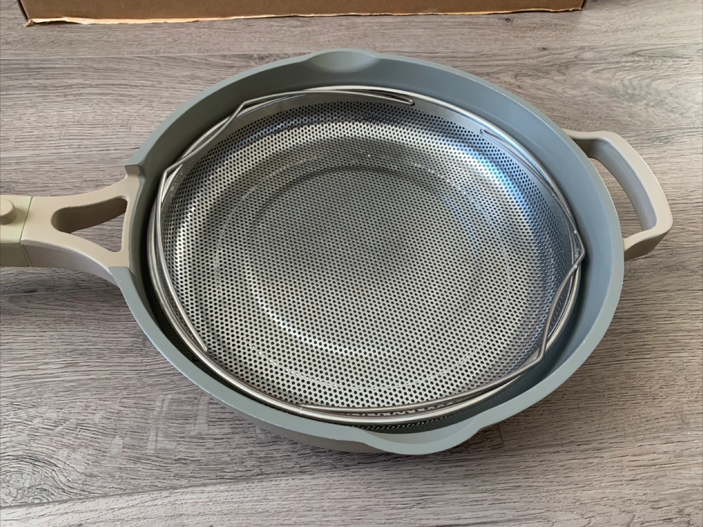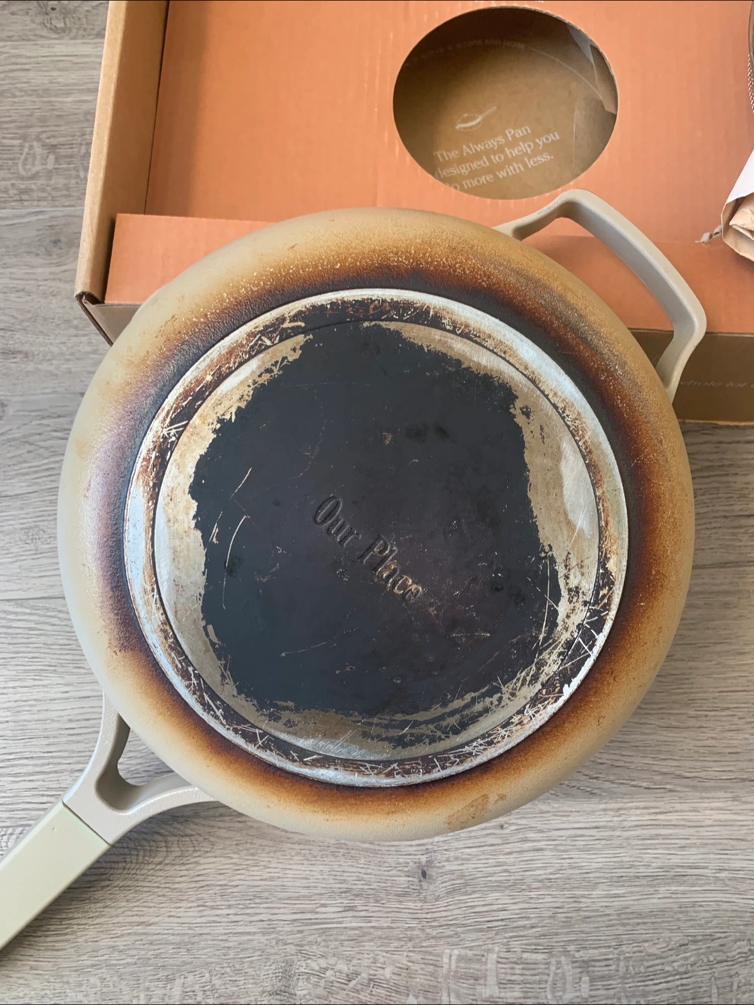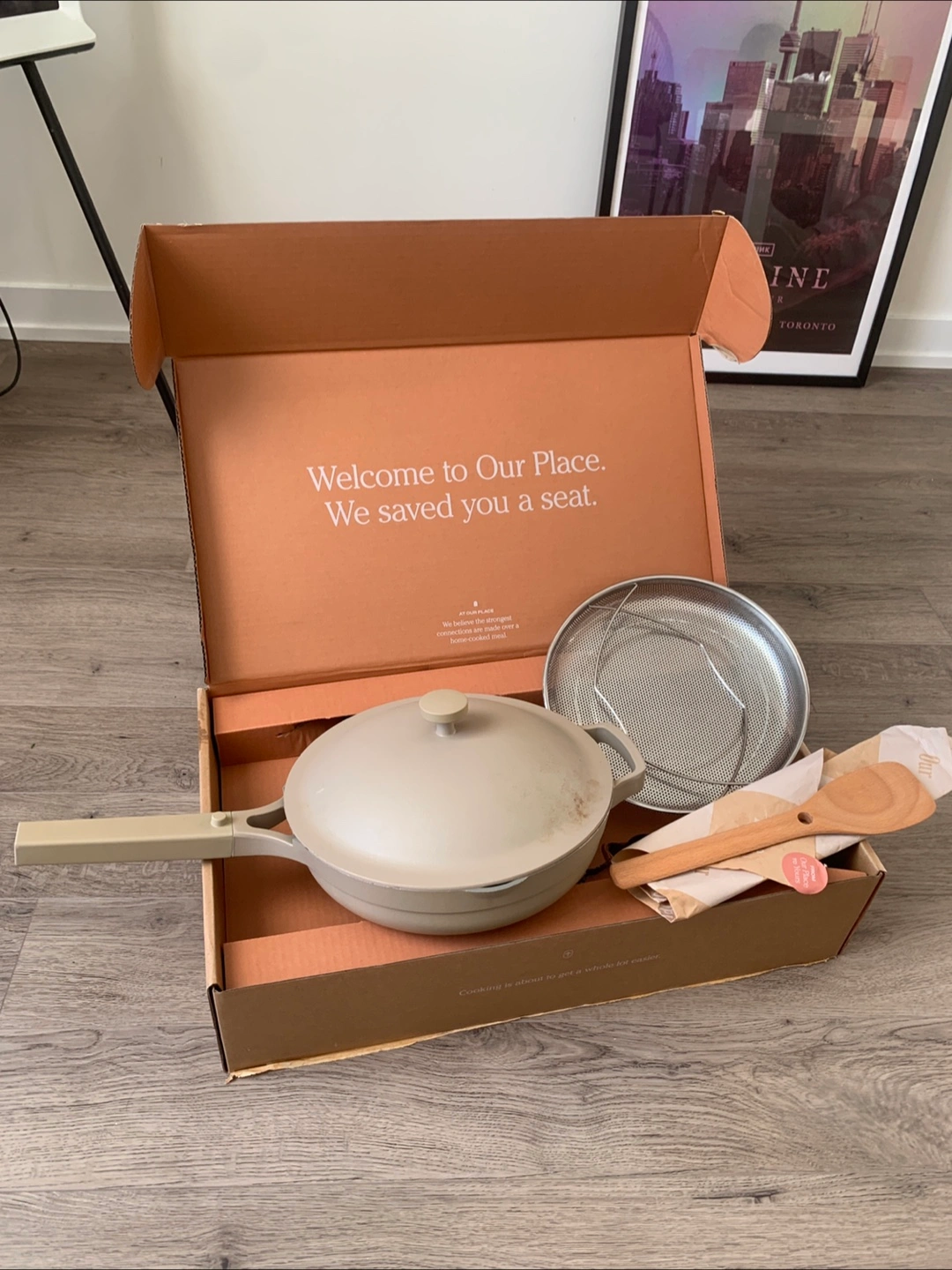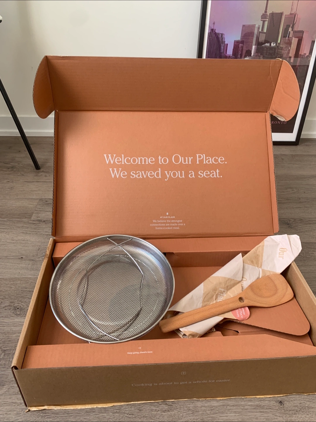 Selling an Our Place Always Pan in good condition! It comes with the steamer basket and wooden spatula. The original box is included as well. This pan is designed to replace 8 traditional pieces of cookware, making it a versatile addition to any kitchen ( # steamer basket and spatula is new )