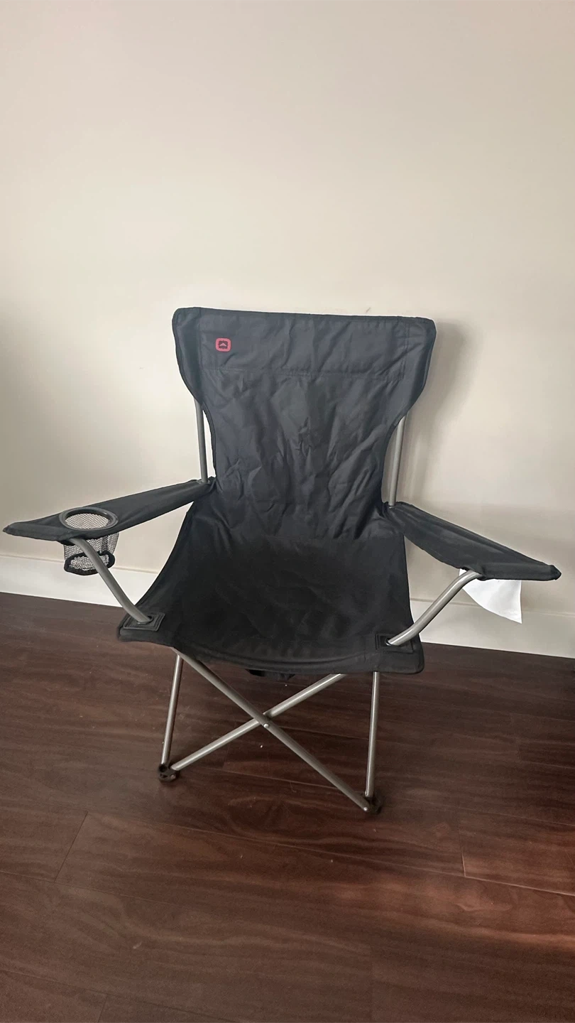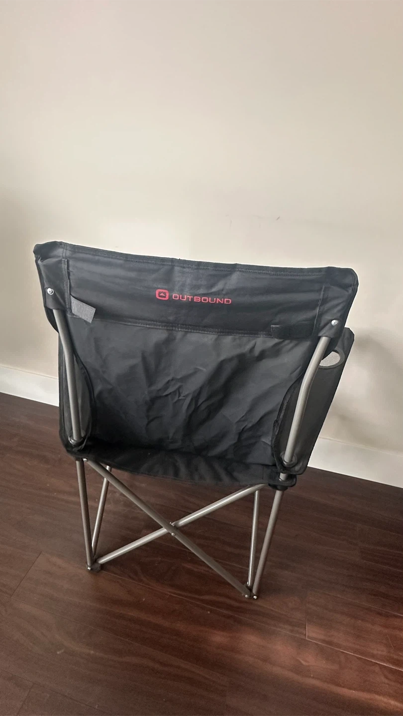 Selling a black Outbound camping chair! It's lightweight and easy to carry, perfect for camping trips or just relaxing in the backyard. It also has a convenient cup holder