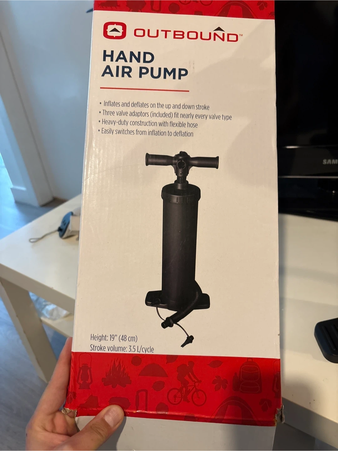 Get ready for your next outdoor adventure with this Outbound Hand Air Pump! It's in excellent condition and ready to inflate all your gear. - Inflates and deflates on the up and down stroke - Includes three valve adaptors to fit nearly every valve type - Heavy-duty construction with a flexible hose - Easily switches from inflation to deflation Height: 19" (48 cm) Stroke volume: 3.5 L/cycle Can also deliver ๐