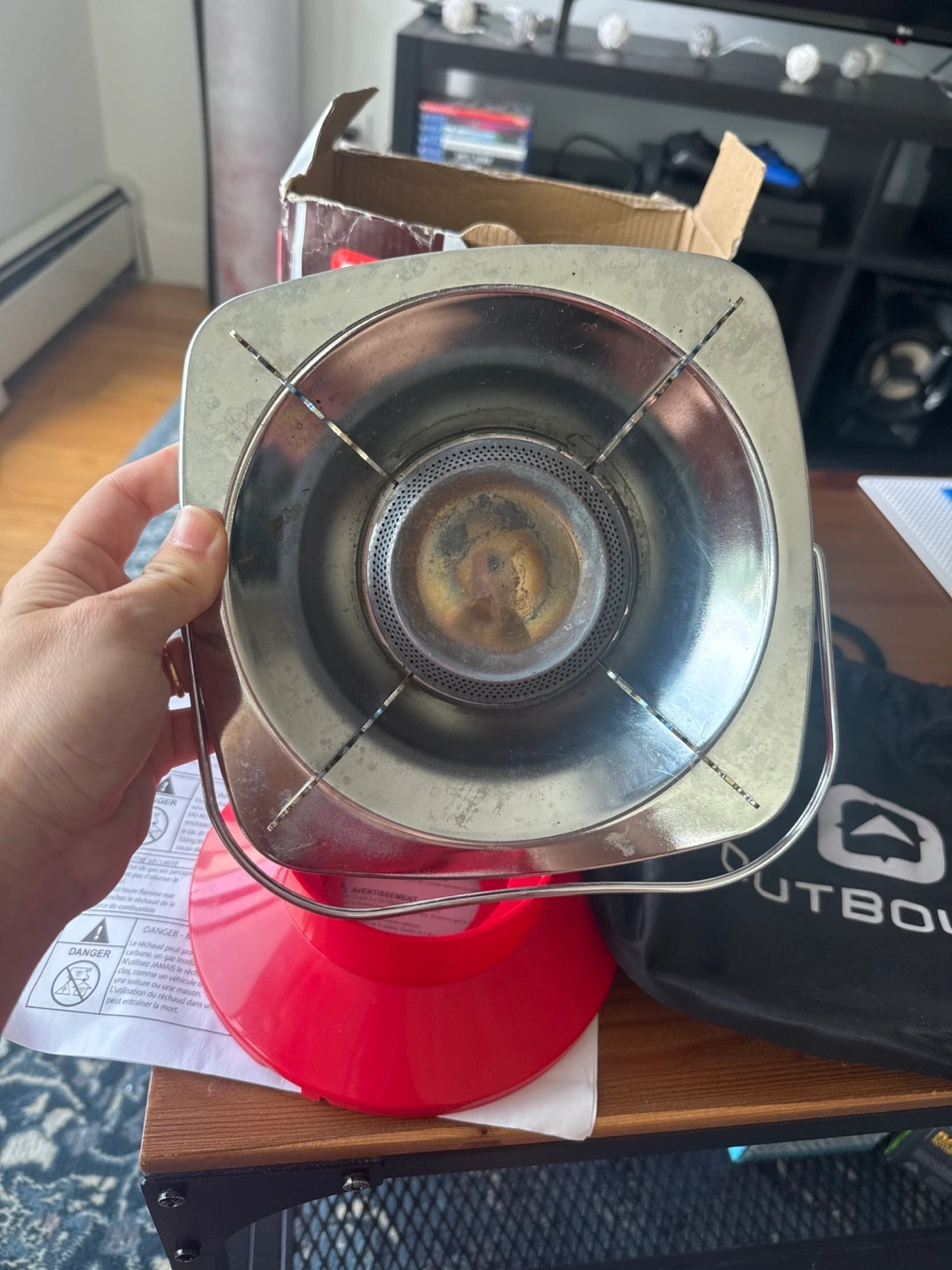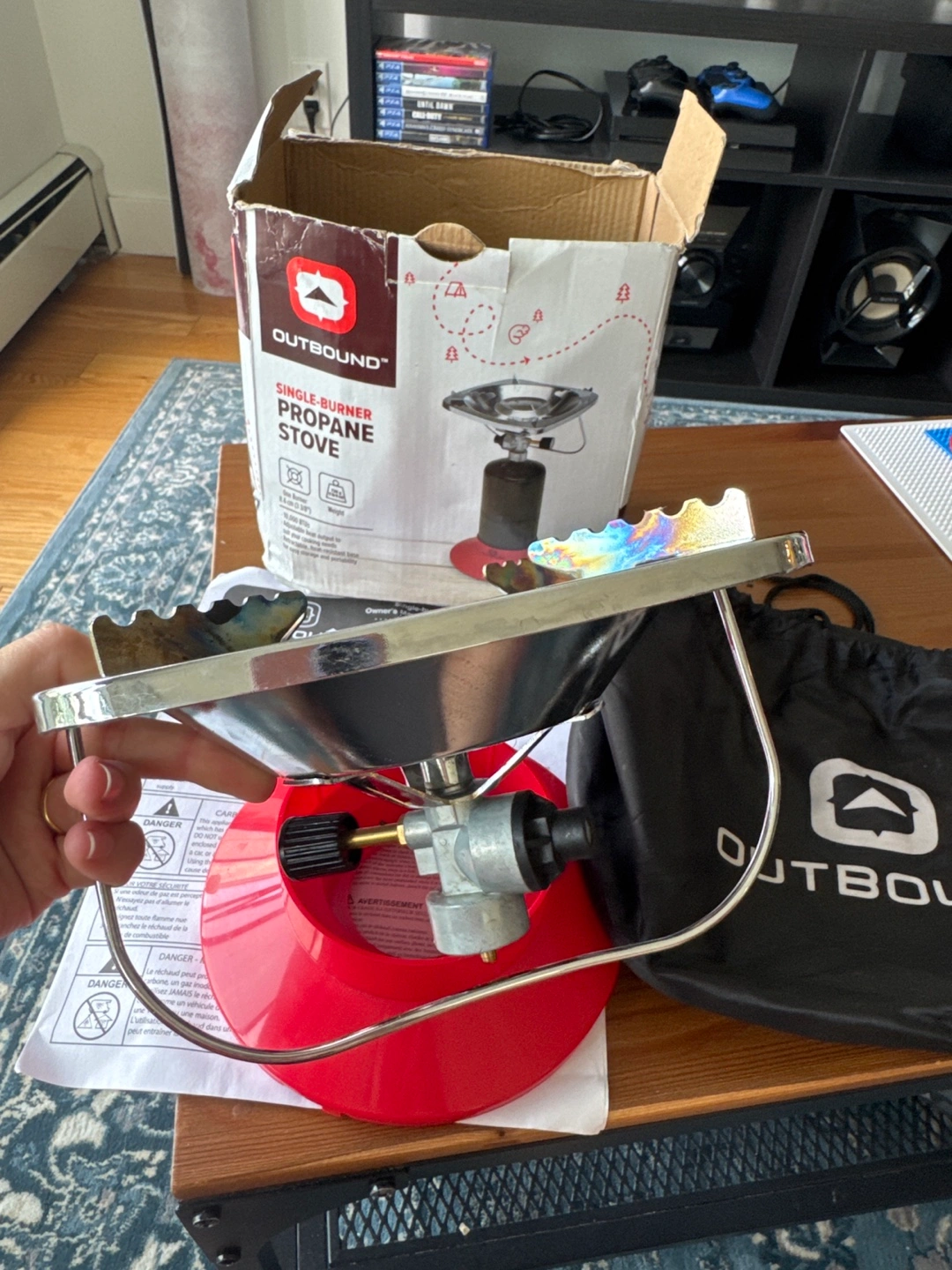 Selling an Outbound single burner propane stove. It comes with the box, instruction manual, the stove itself, a red base, and a carrying bag. Great for camping or cooking outdoors