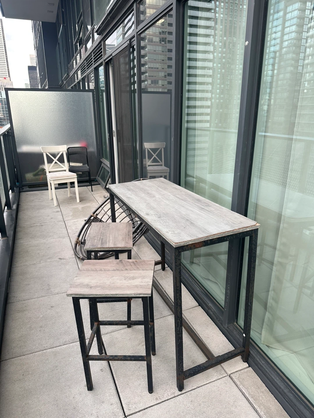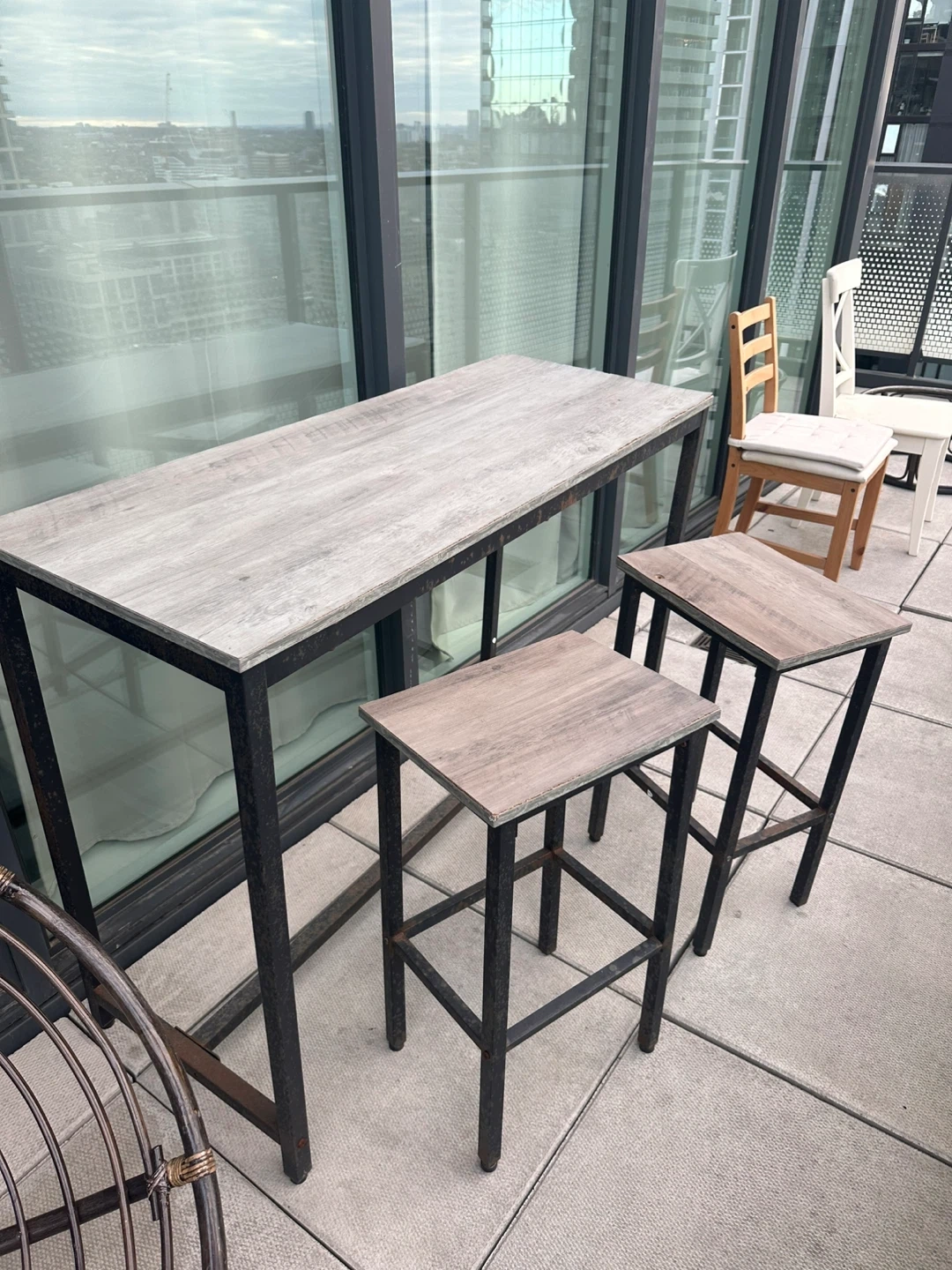 Selling an outdoor bar table with two matching stools. The table and stools have a rustic, industrial look with a light grey wood-look top and black metal frames. Perfect for a small balcony or patio! Perfect for outside would not recommend indoor.