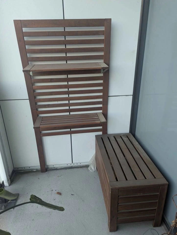 ÄPPLARÔ Bench with wall panel, outdoor - brown stained. 31 1/2x17 3/8x62 1/4". Pick up only King and Parliament