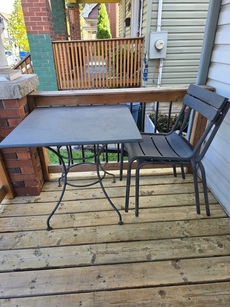 Looking to sell this cute outdoor bistro set. It includes a square table and one matching chair. Perfect for a small balcony or patio. The set is in good condition and ready for a new home! solid metal , pick up only