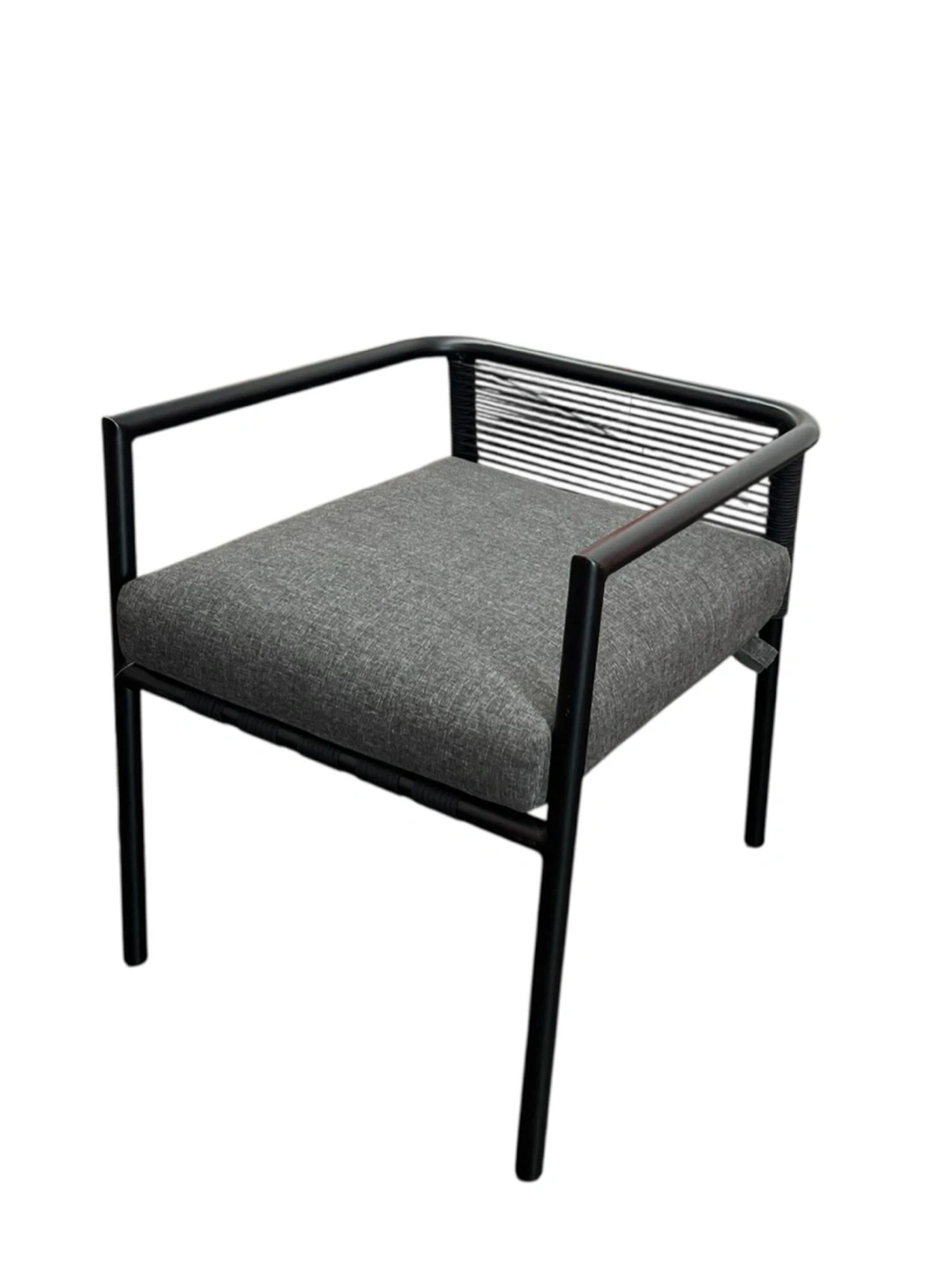 Comfortable armchair with a sturdy black frame and a cozy grey cushion. Perfect for adding a touch of modern style to your outdoor space The woven back adds a unique design element