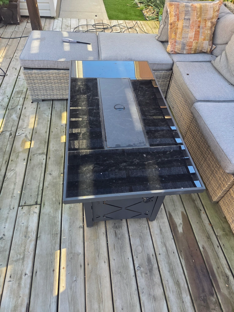 Selling an outdoor fire pit table. It features a black glass top and a grey base. Perfect for adding warmth and ambiance to your patio or deck!