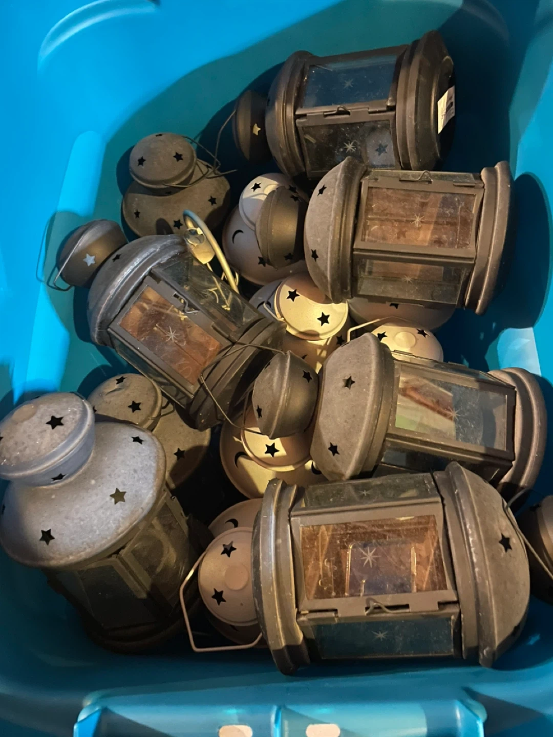 Selling a collection of outdoor lanterns 8 black and 8 grey and 2 grey/silver with stands. They have star cutouts and glass panes. Perfect for adding a cozy touch to your patio or garden! $3 each or all 18 for $30 bucks!