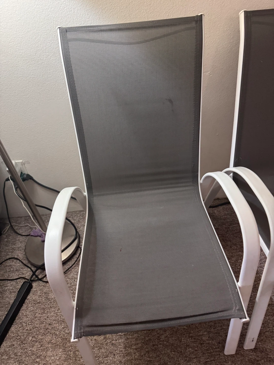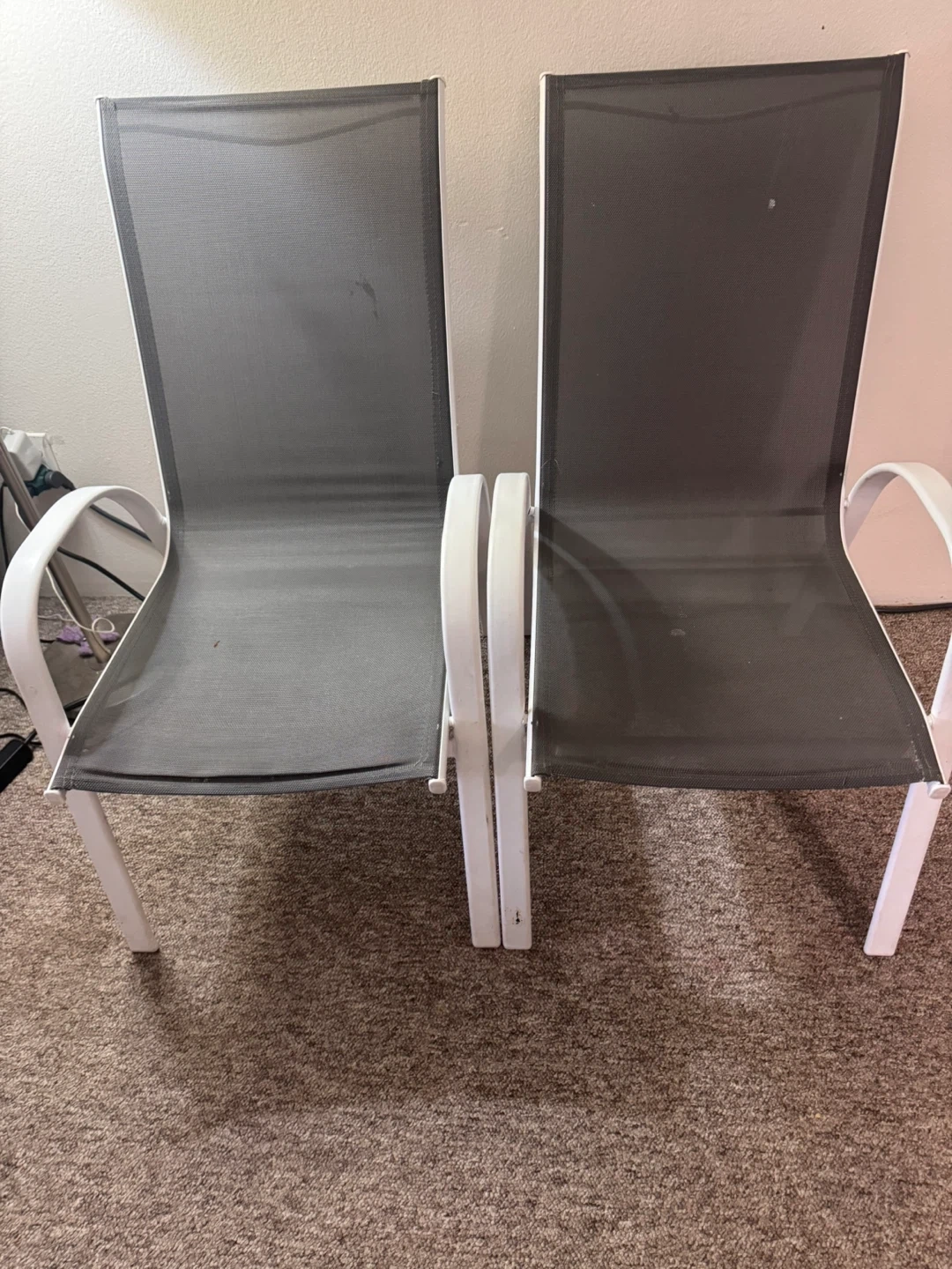 Selling a set of two outdoor patio chairs. They feature a sleek design with a grey mesh seat and white frames. Perfect for your backyard or balcony!