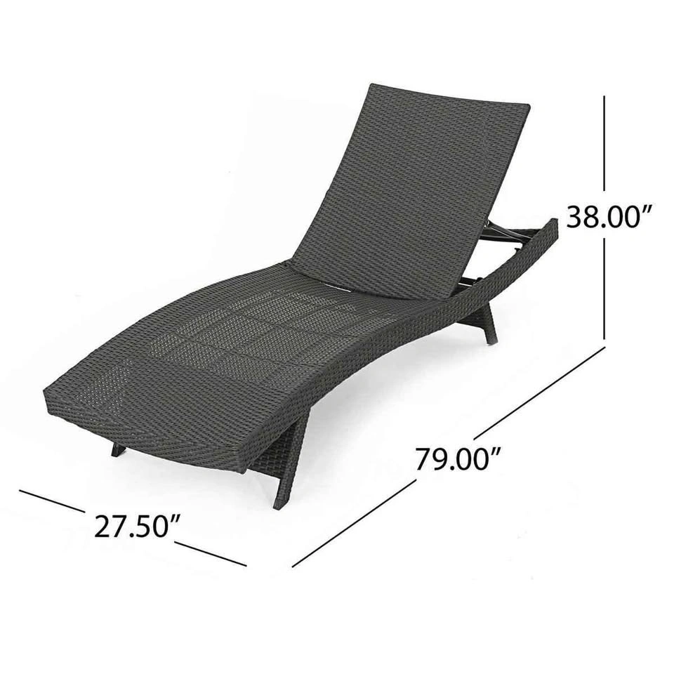 Relax in style with this elegant and durable outdoor chaise lounge chair. Perfect for your poolside, patio, garden, or balcony. Features: Weather-resistant wicker rattan frame for long-lasting use Adjustable backrest for customizable comfort Sleek grey finish to match any outdoor decor Dimensions: 79” L x 27.5” W x 38” H Ideal for sunbathing, reading, or lounging outdoors Condition: Brand new – only opened for inspection. Pulled from a liquidation pallet. Retail Price: 2-piece set sells for $1,369.99+tax on Wayfair (this is for 1 chair)