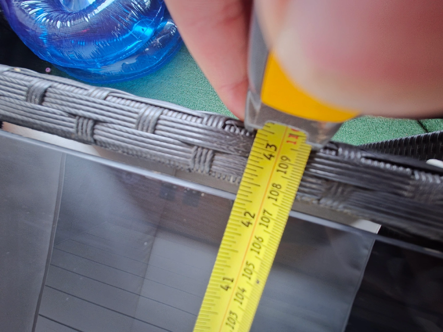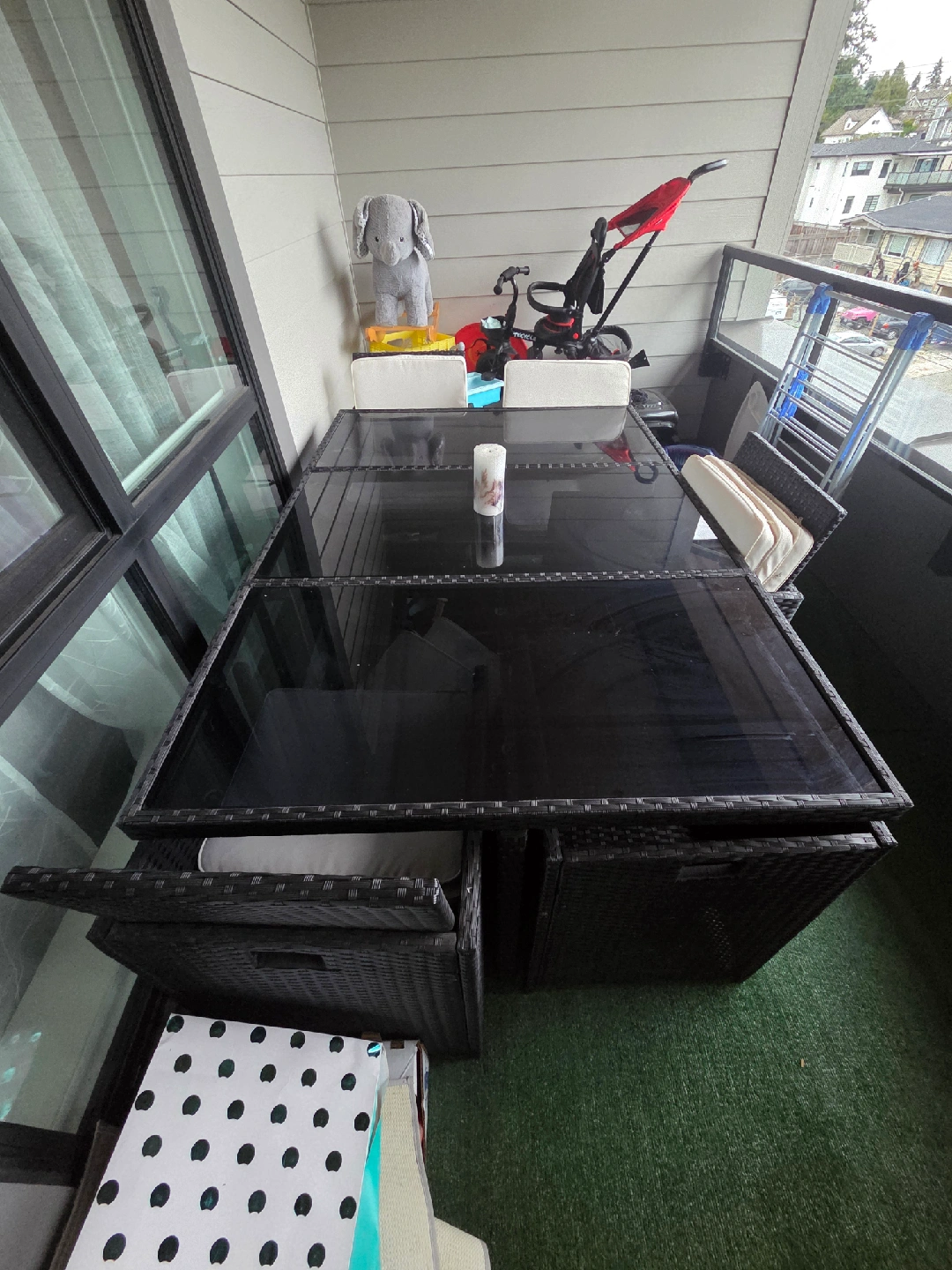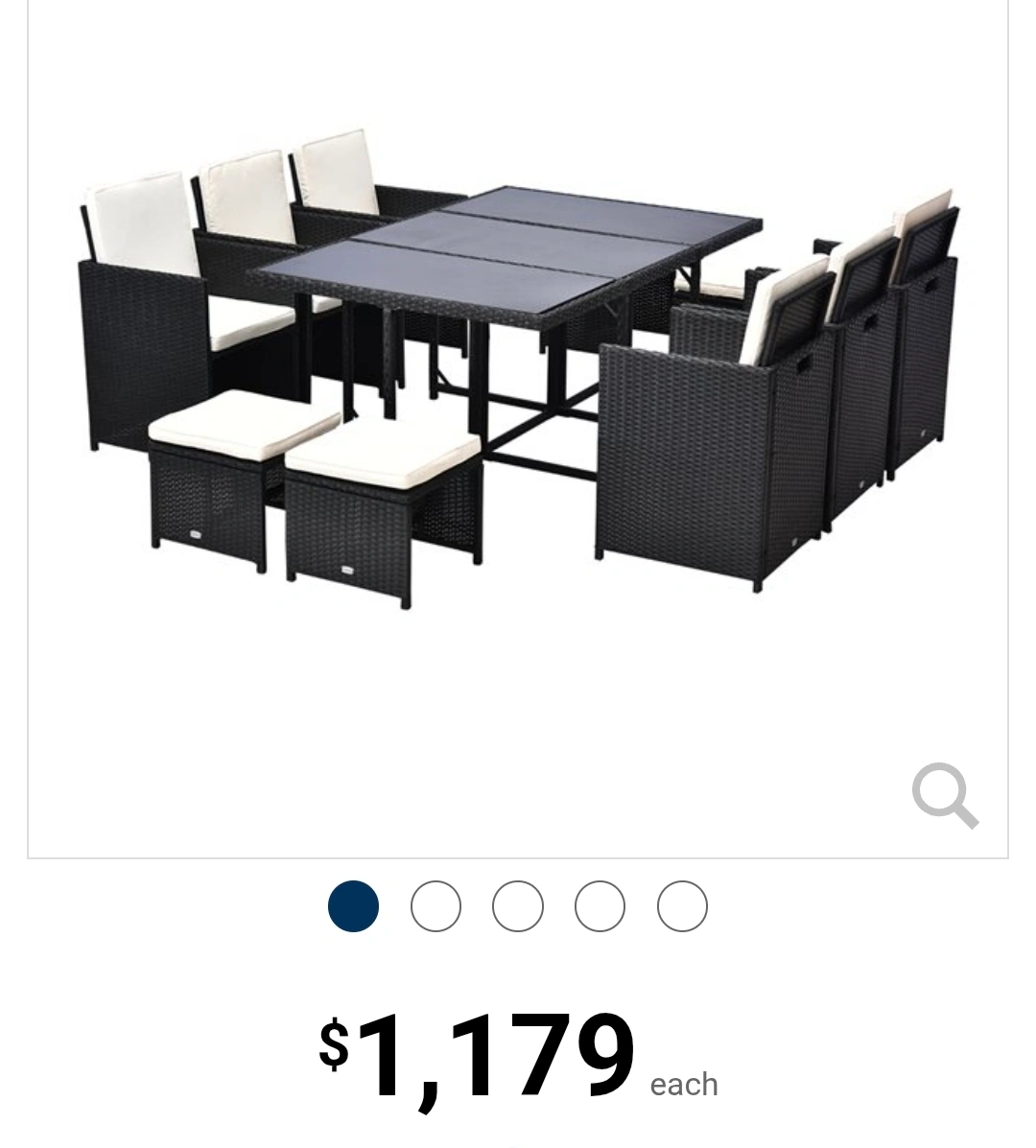 Selling a patio dining set that includes a table with 6 chairs, alongside cushions. The table measures approximately 66 inches in length and 43 inches in width. Originally bought for $1,200, only used handful of times.