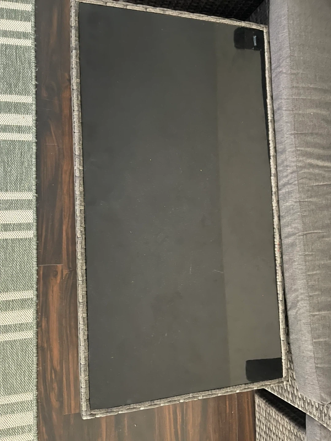 Selling a lovely outdoor patio sectional sofa set! It's in great condition and perfect for enjoying those warm summer evenings. The set includes a sofa, a coffee table with a glass top, and an ottoman. The cushions are a comfortable grey colour, and the wicker frame is a stylish addition to any outdoor space