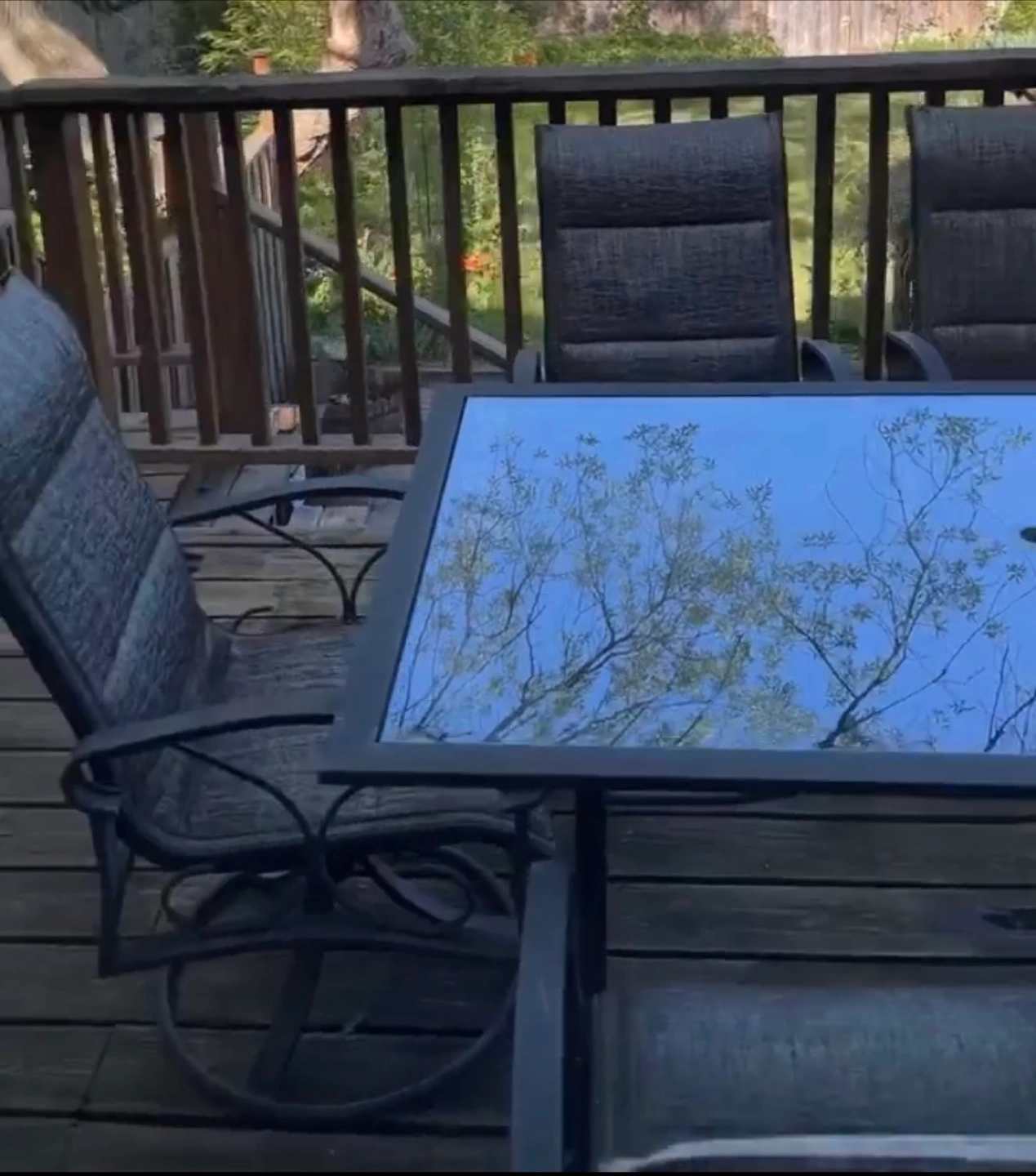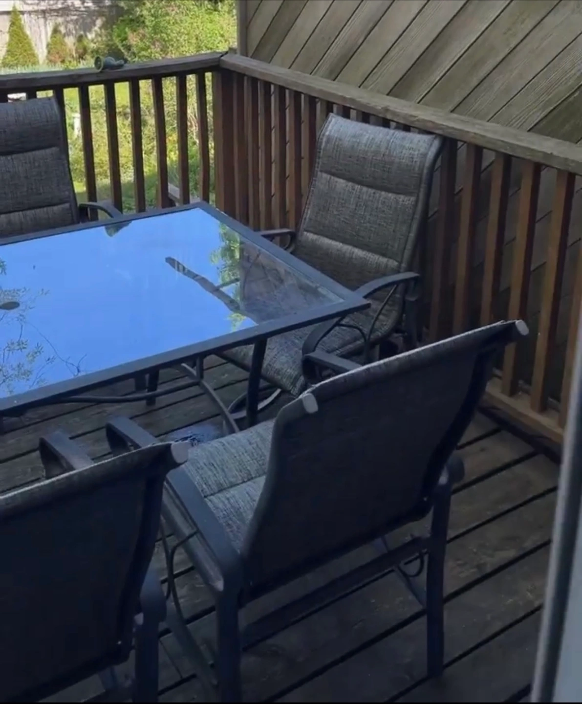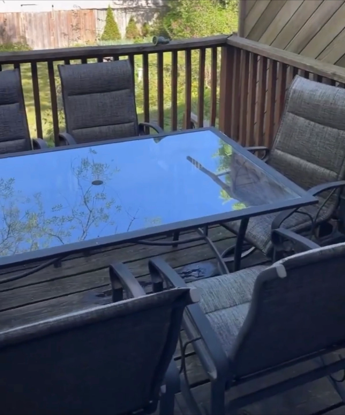 Seven-piece patio set. Rectangle glass table. Six chairs with grey cushions. Metal frame. Great for small spaces. PICK UP ONLY.