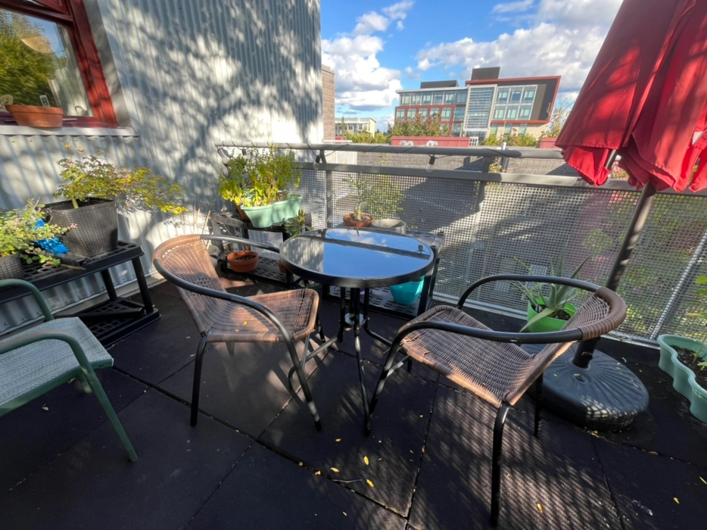 Selling a used outdoor patio table with two chairs. Perfect for a small balcony or patio space. The chairs are made of durable woven material with metal frames. The table has a glass top and can be disassembled if needed.