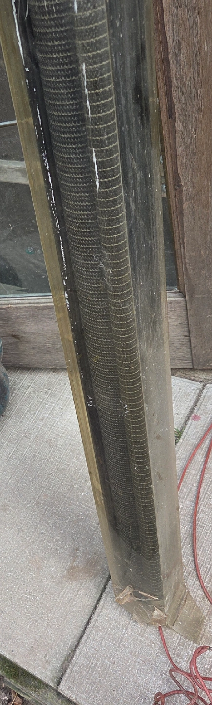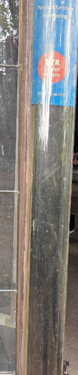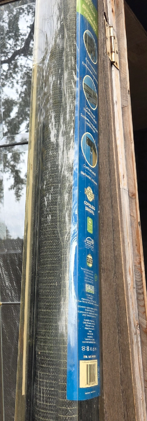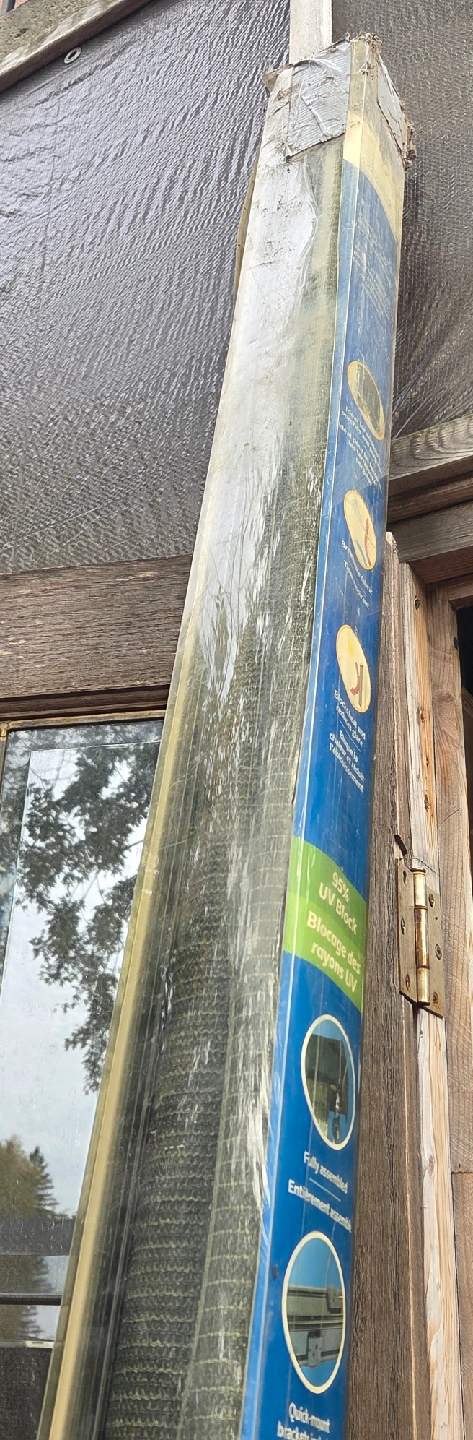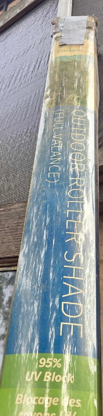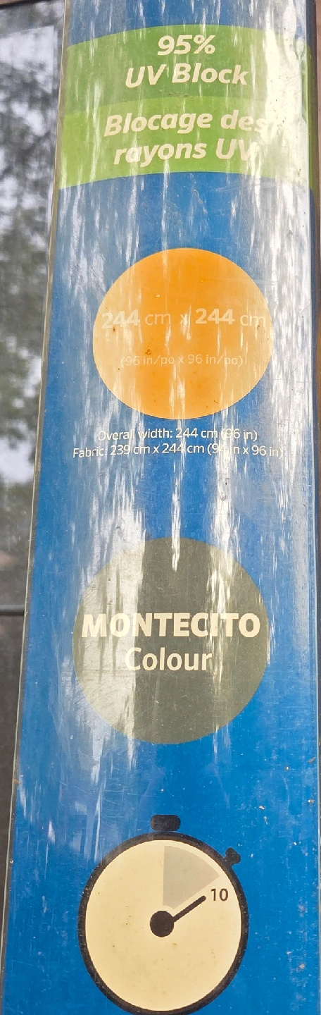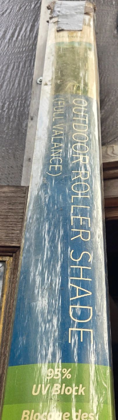 Outdoor roller shade still in packaging! It's 96 inches by 96 inches. The colour is Montecito. It blocks 95% of UV rays and reduces energy costs. It also cuts install time in half!