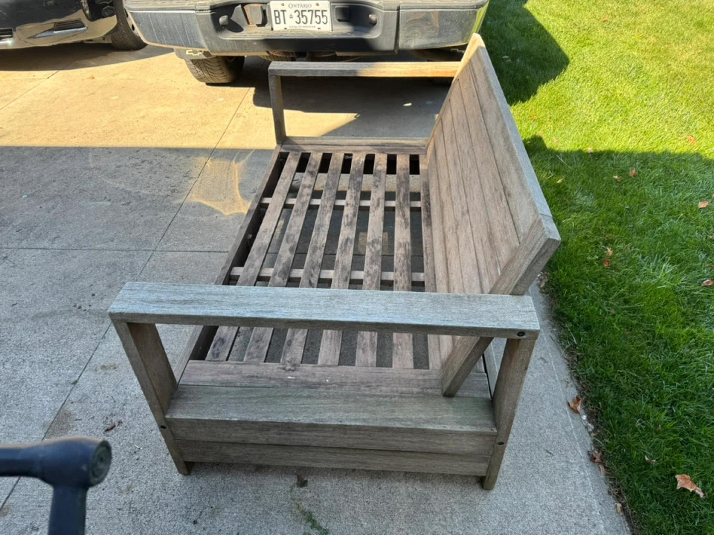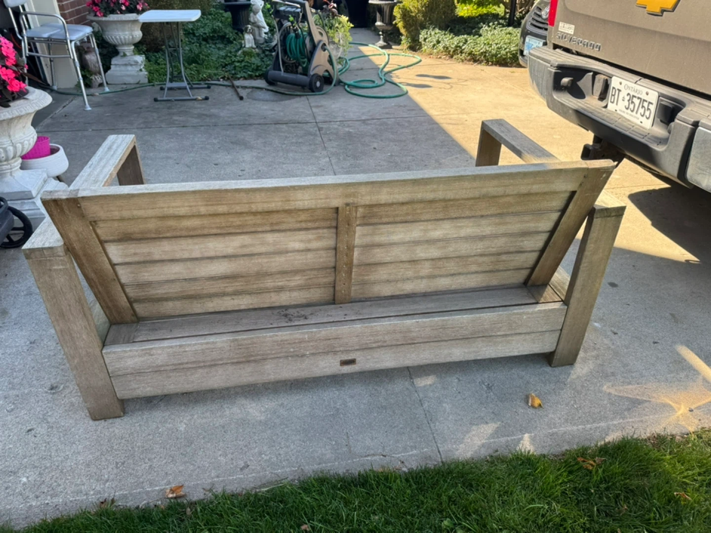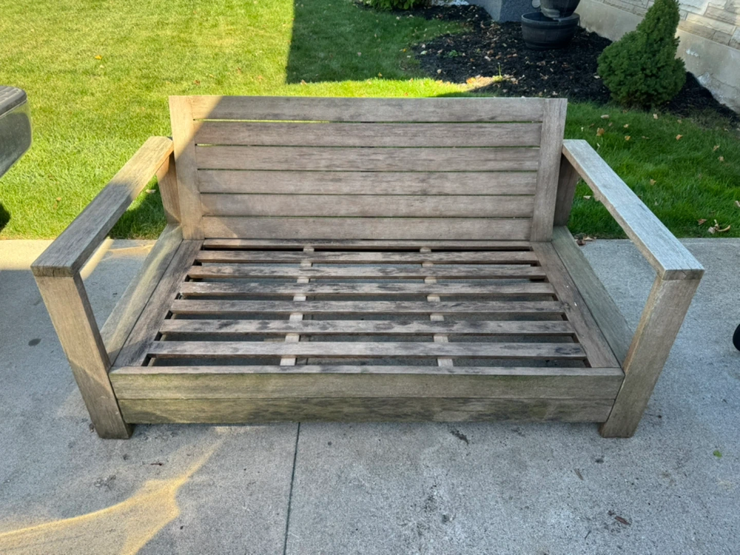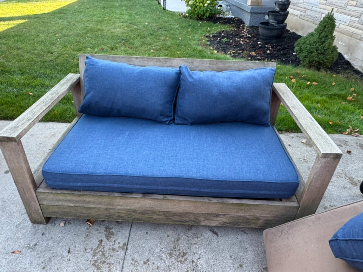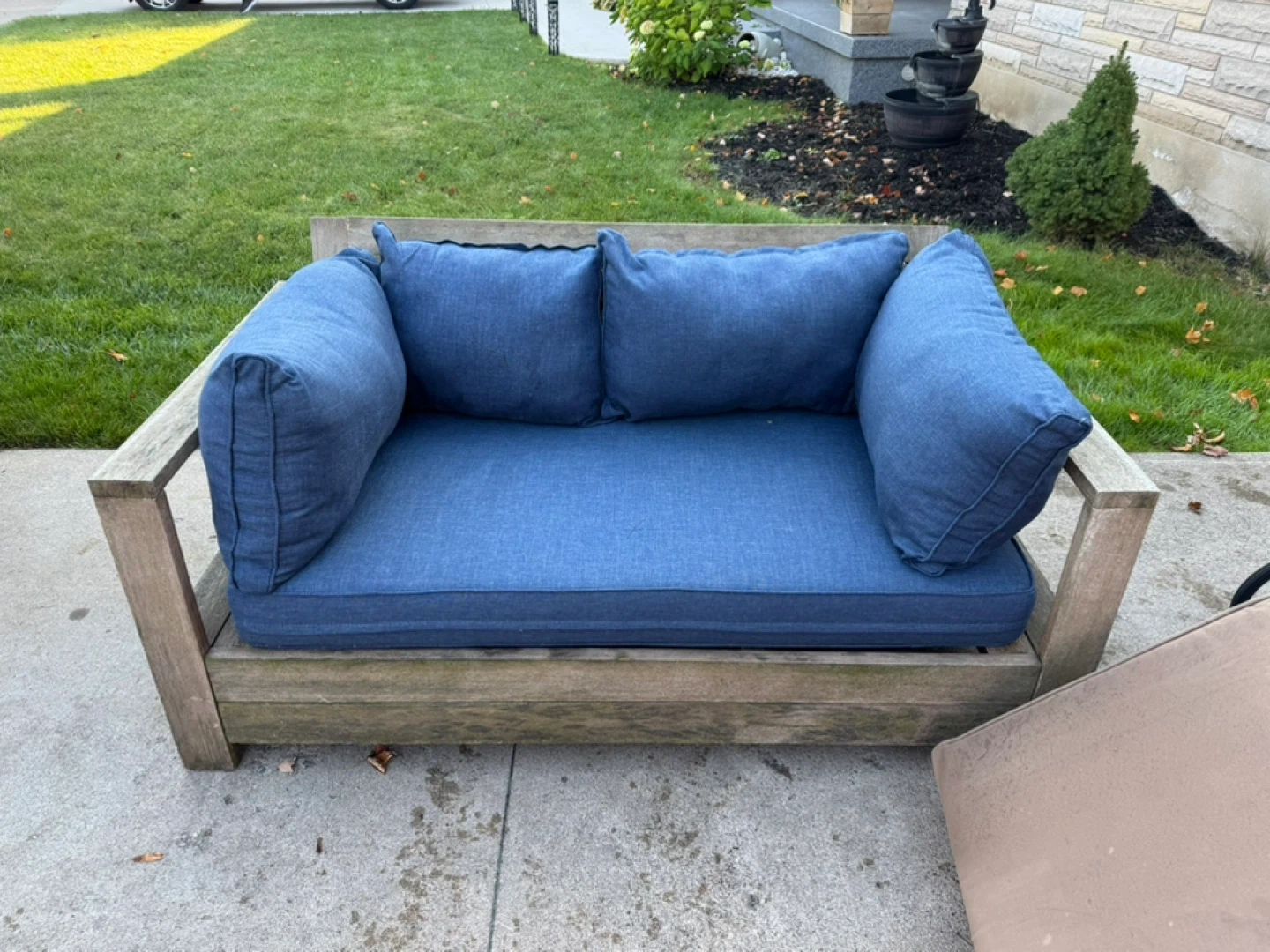 Outdoor wooden sofa with comfortable blue cushions. It's a great addition to any patio or garden space. The cushions are in good condition and the wooden frame is sturdy. Perfect for relaxing outdoors!