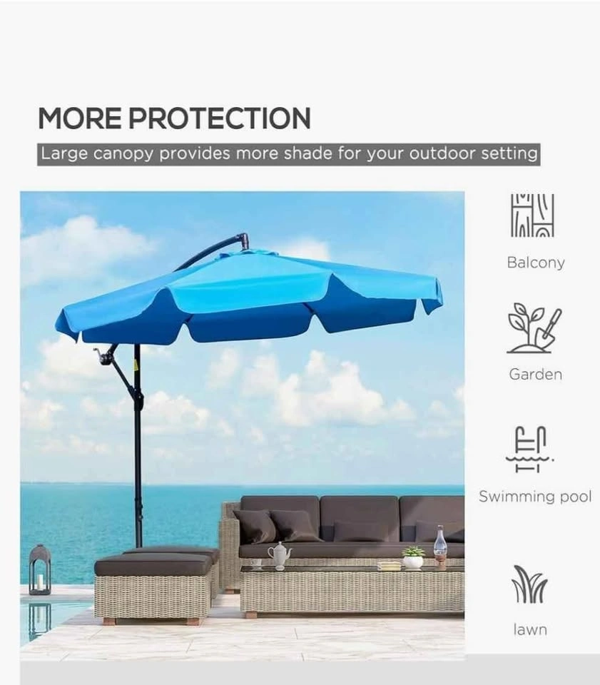 This offset cantilever umbrella can cover large patio furniture that doesn't have a hole to mount a standard umbrella to. Use it to cover outdoor sectionals, pool lounge chairs, or patio dining sets to provide comfortable shade even in difficult situations. Tough steel frame for extra strength. Connected to the canopy with 8 ribs for stability. Open and close the large patio umbrella in seconds with the easy-to-turn crank handle. The offset patio umbrella can stand more stable by adjusting knobs on the column of the umbrella base. The top vent of the polyester canopy allows air to pass through, helping to prevent it from lifting the offset umbrella. Overall Dimension: 8.7' x 8.7' H, Pole Size: 2". Assembly required. Item Weight: 25.08 lbs.