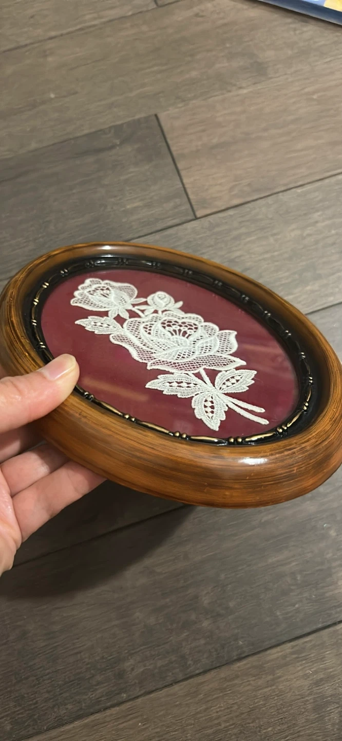 Here's a lovely piece of framed lace art! It features a delicate white lace floral design set against a rich, deep red background, all encased in an oval wooden frame. It would be a charming addition to any room!