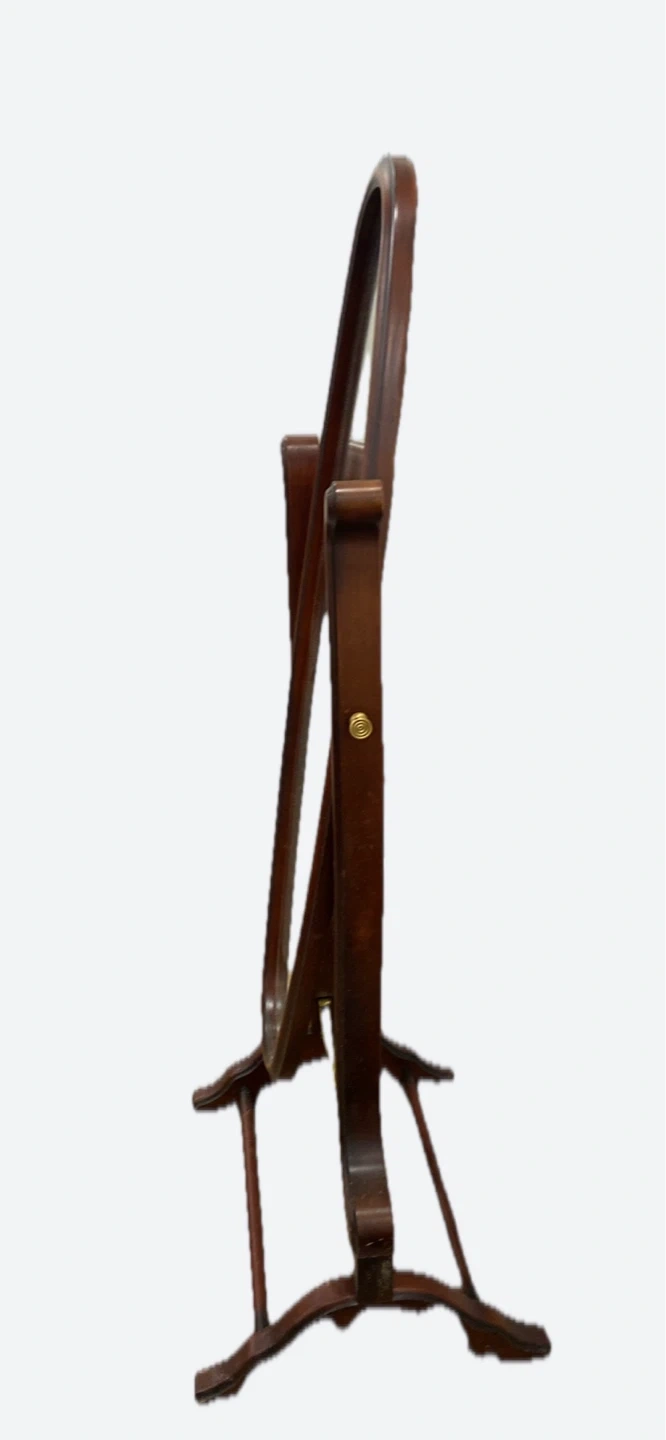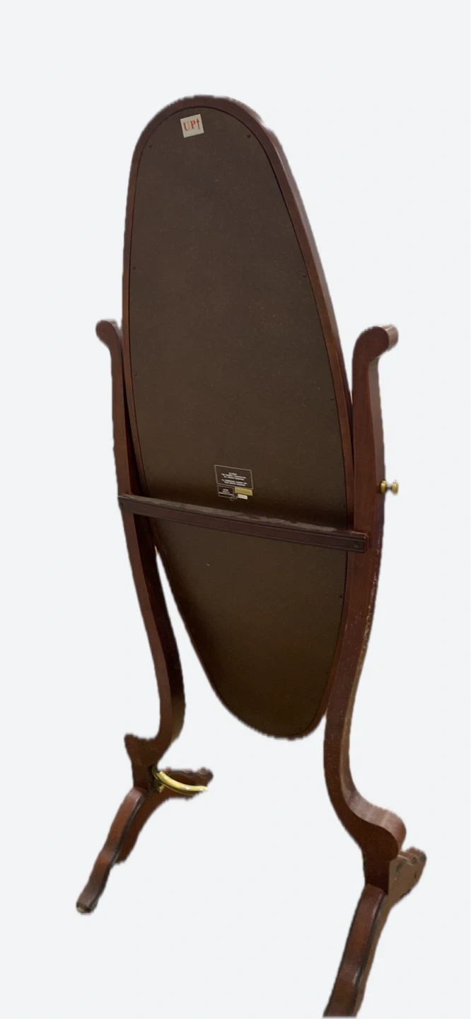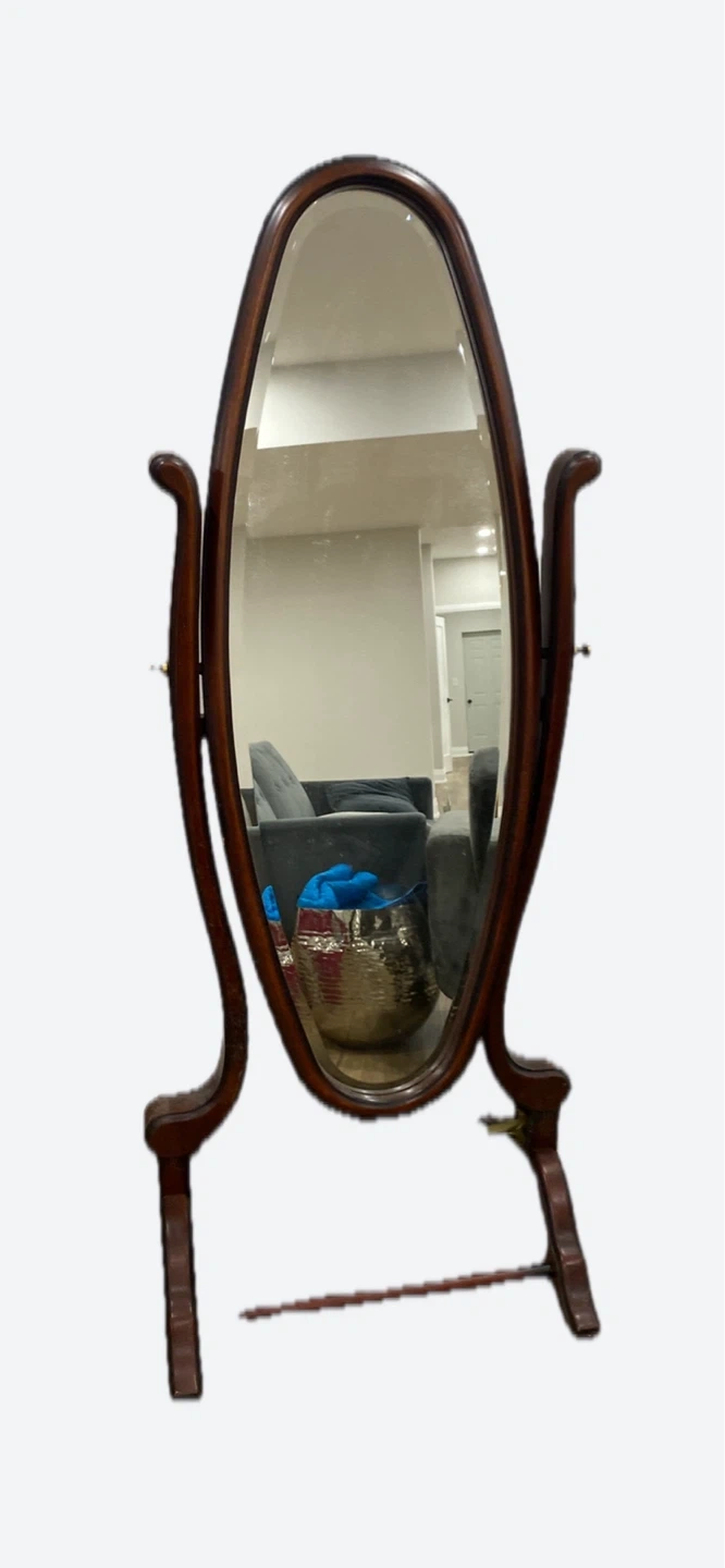 Selling a lovely oval cheval mirror with a solid mahogany frame! It is in great condition and would look great in any bedroom or dressing room. The mirror tilts, so you can adjust it to the perfect angle