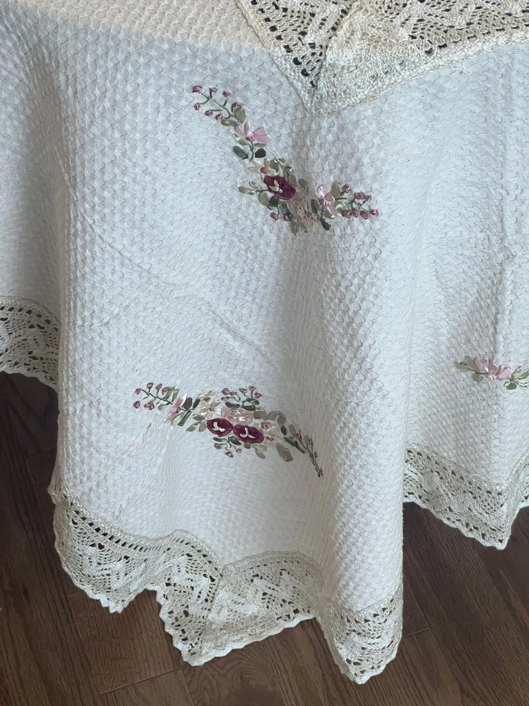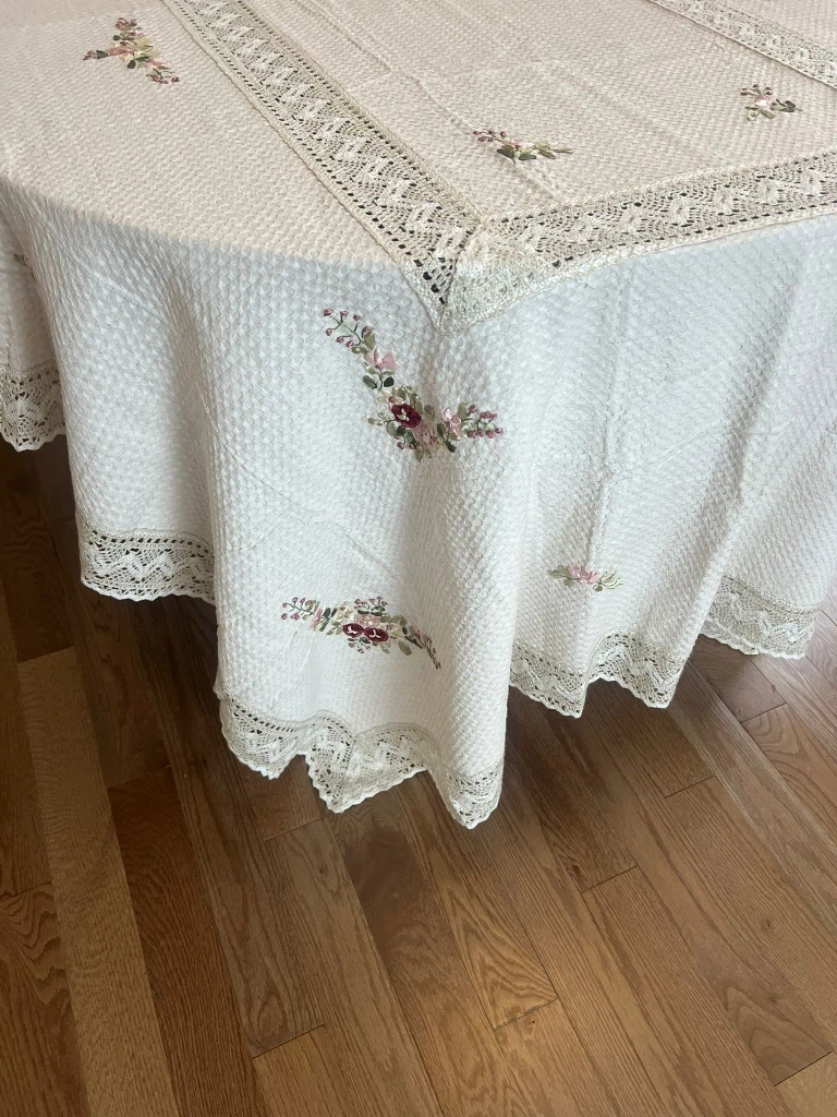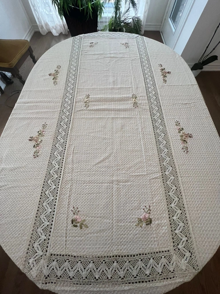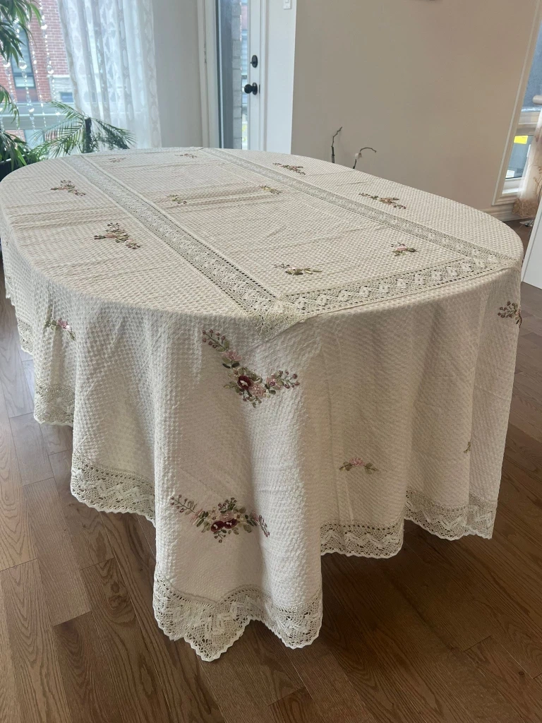 Selling a lovely oval tablecloth! It features delicate floral embroidery and a charming lace trim. The material has a subtle textured pattern that adds to its elegance. Perfect for dressing up your dining table for special occasions or everyday use
