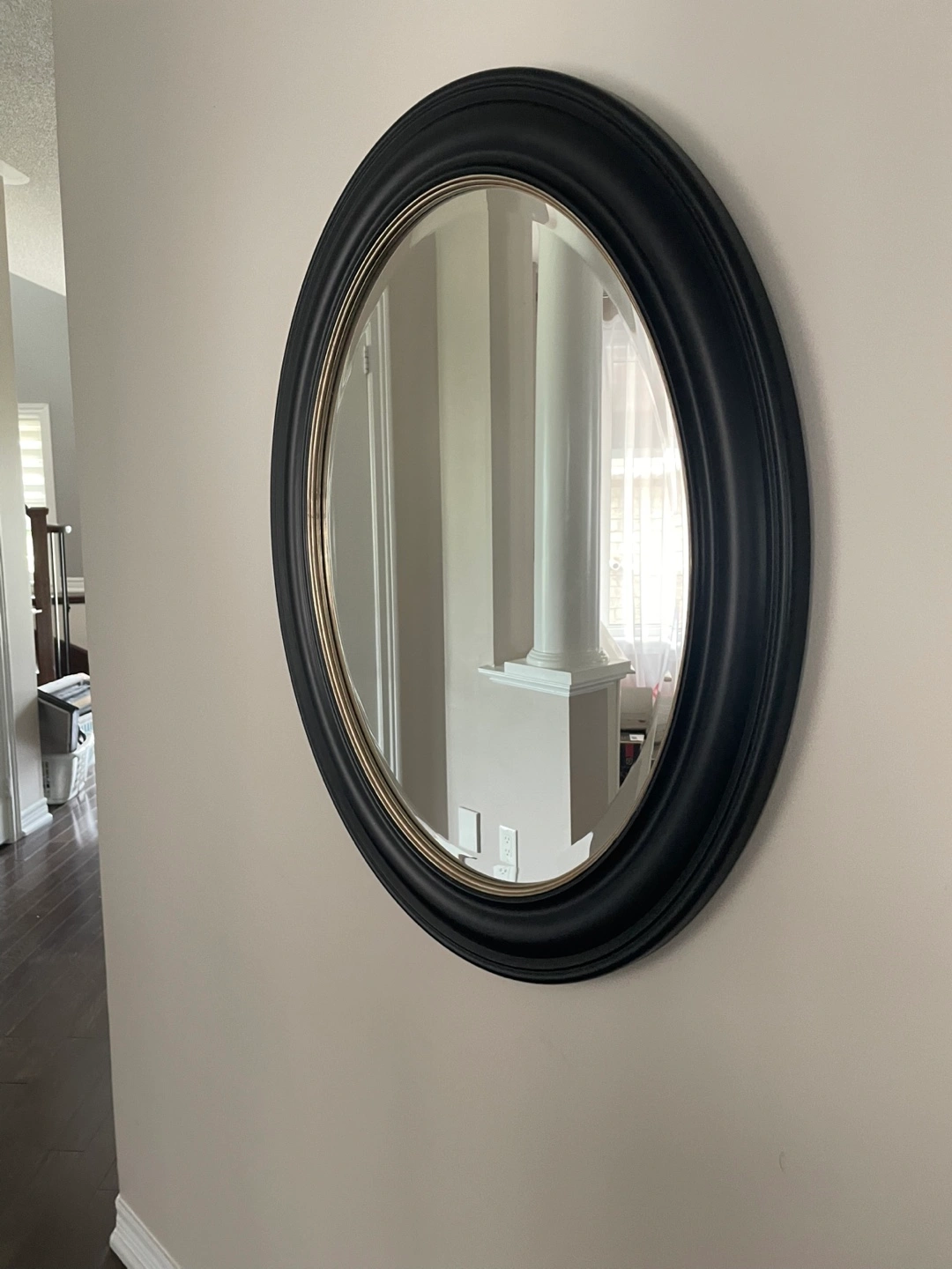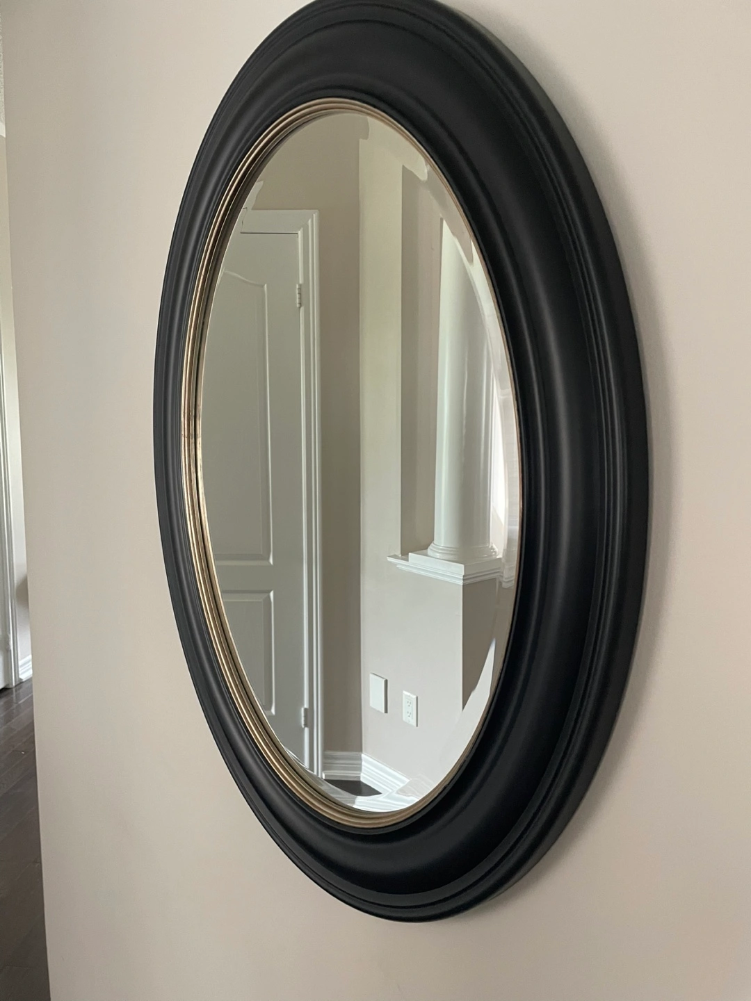 Selling a lovely oval wall mirror with a black frame. It's in great condition and would look great in any room. Perfect for adding a touch of elegance to your home decor! Message me if you're interested