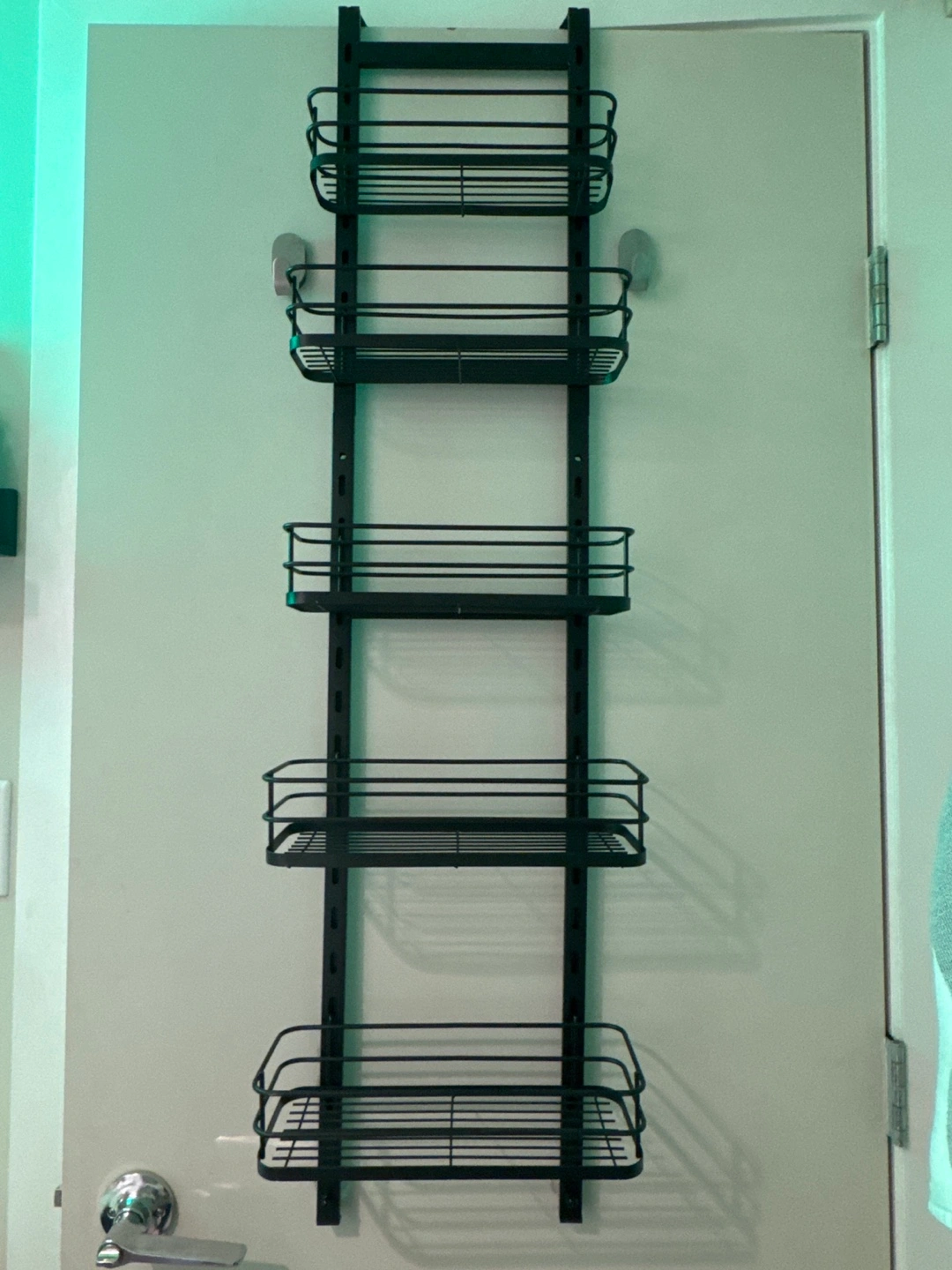 Selling an over-the-door organizer. It is black and has multiple shelves for storage. Great for small spaces to maximize storage! Easy to reposition shelves, hook style (with a cast iron style quality). Solid, and flexible options. Can be used on a closet style door - purchased for 60$ and change, open to offers.