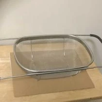 Stainless steel collapsable dish drainer. Perfect for small spaces. Includes a handle. extends over the sink