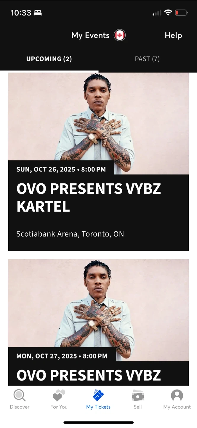 Selling two tickets to OVO Presents Vybz Kartel at Scotiabank Arena in Toronto, ON. - Date: Sunday, October 26, 2025 at 8:00 PM - two single tickets (325$ each) balcony - Date: Monday, October 27, 2025 at 8:00 PM ( three single tickets balcony $325 each) Thursday Oct 30th at 8:00 ( floor $550)