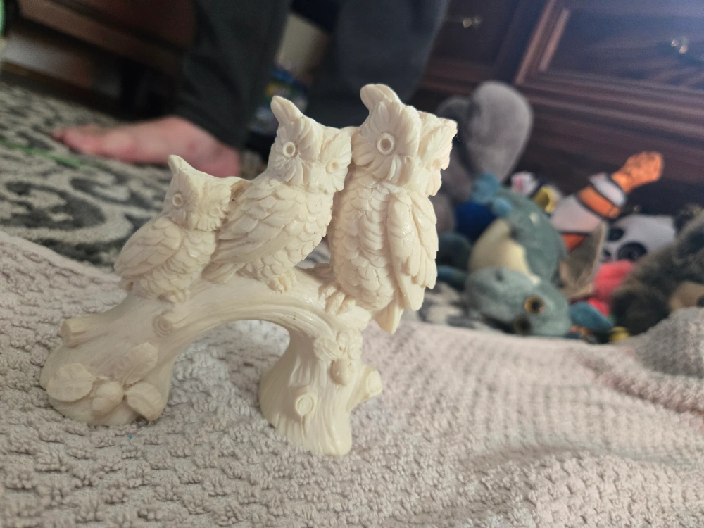 Cute owl family figurine for home decor! It features three owls perched on a branch. Perfect for adding a touch of nature to your space