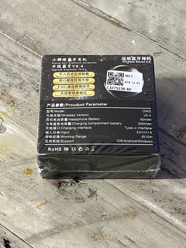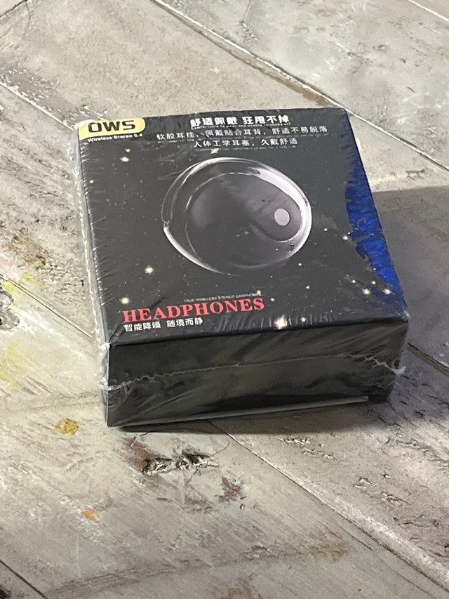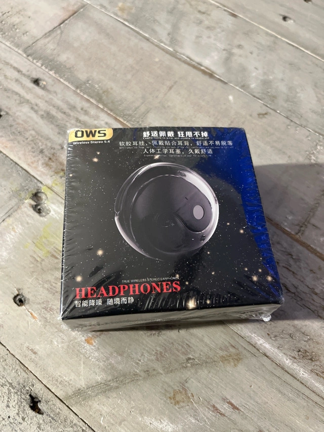 Listen to your favourite tunes with these OWS wireless stereo 5.4 earbuds! These earbuds are brand new, still sealed in the box! We have 2 units available!