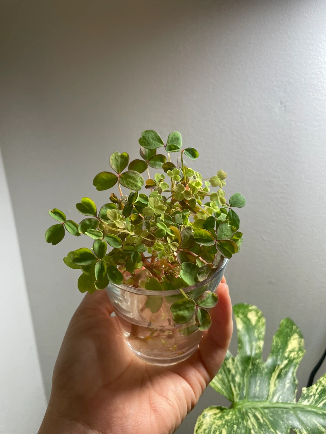A lovely little oxalis plant, happily growing in a clear glass. It's a charming addition to any indoor space and easy to care for