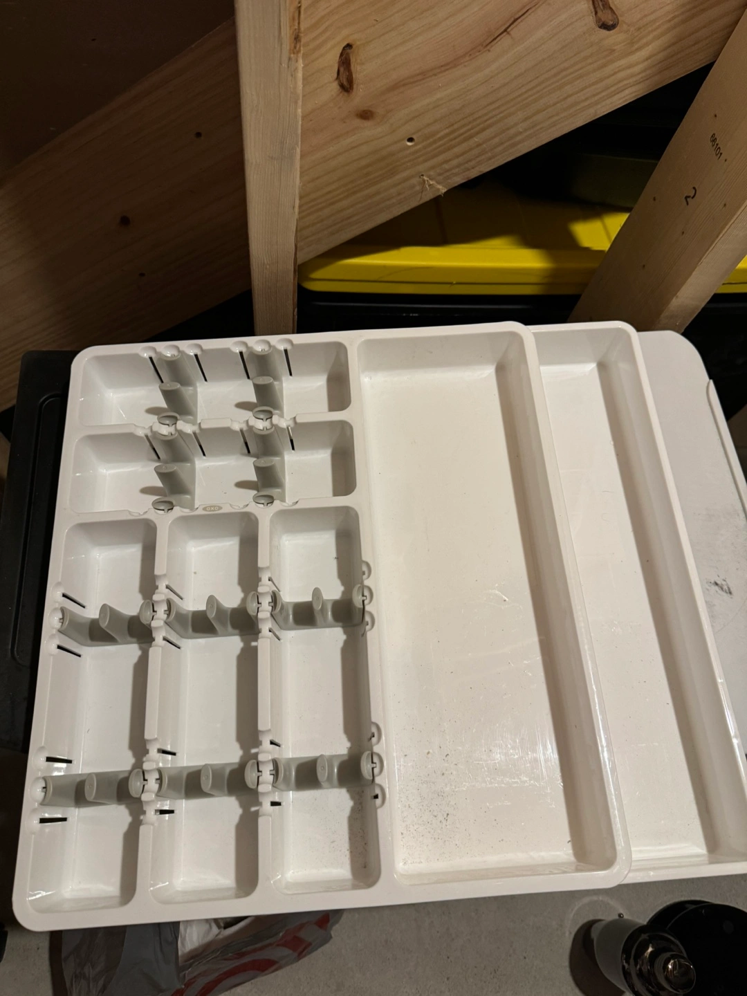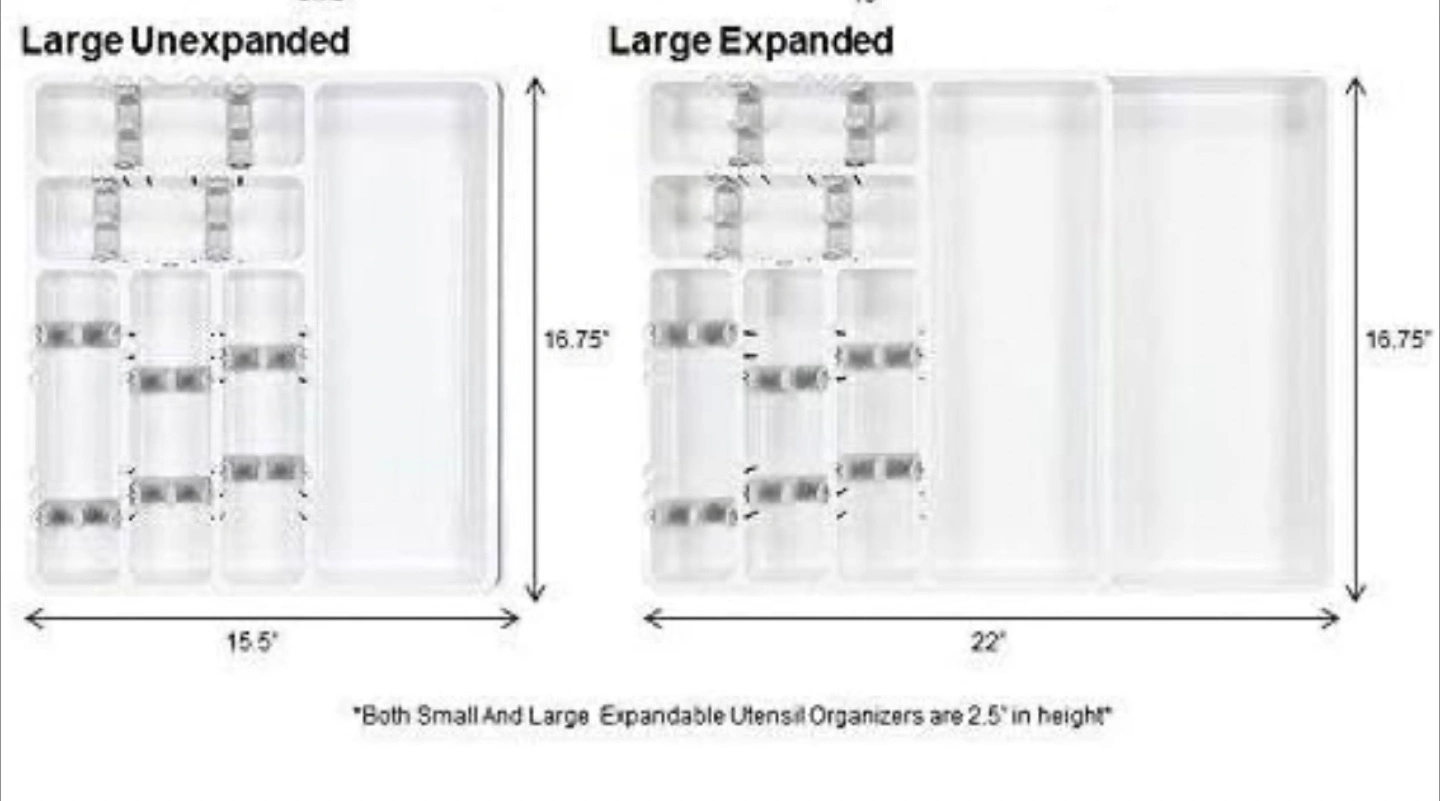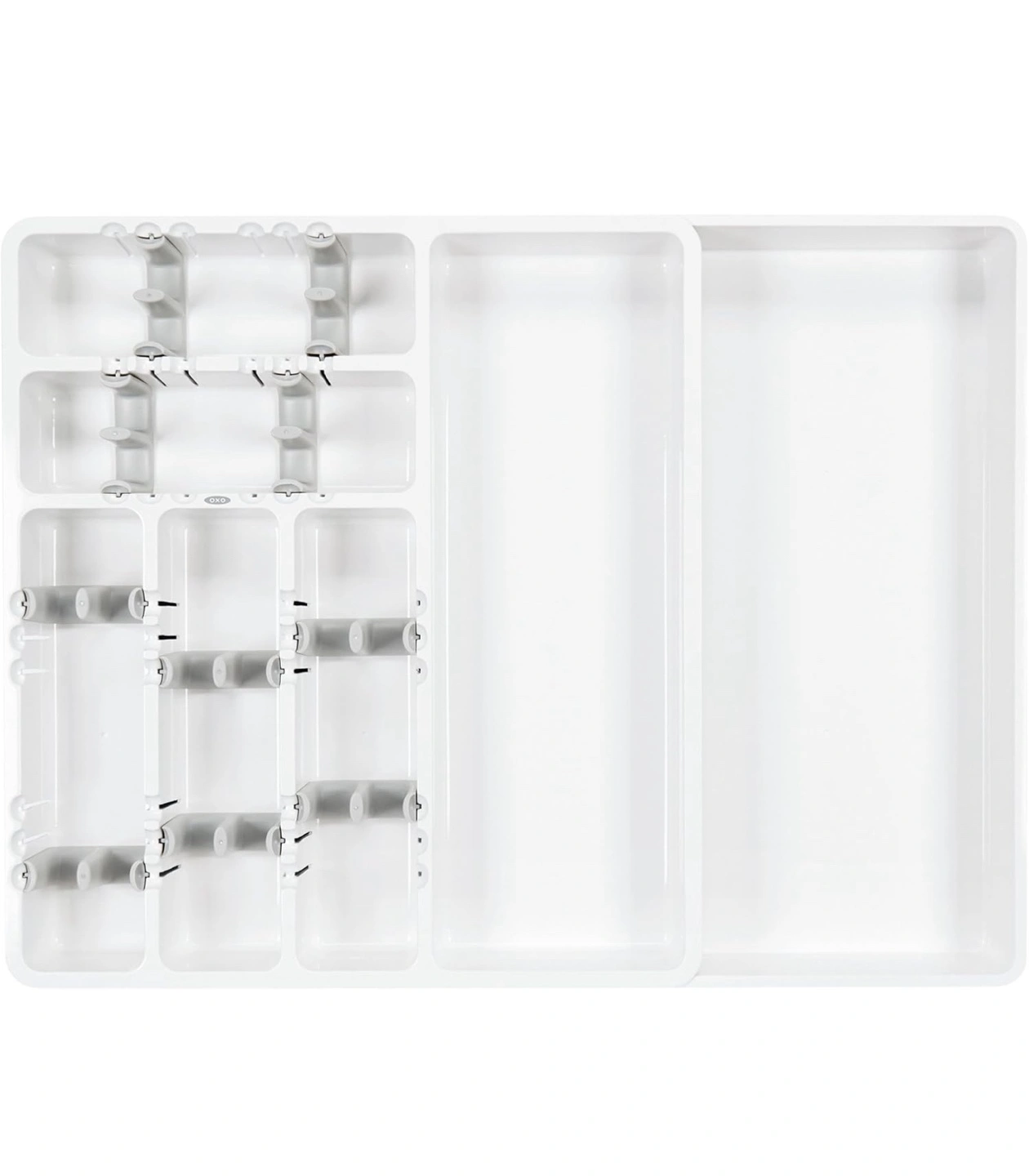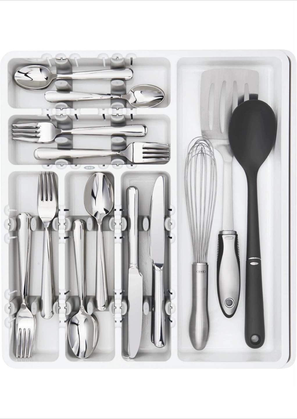White plastic expandable utensil tray. Multiple compartments for cutlery and utensils. Great for kitchen drawer organization.