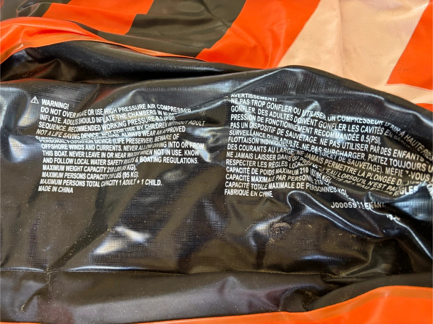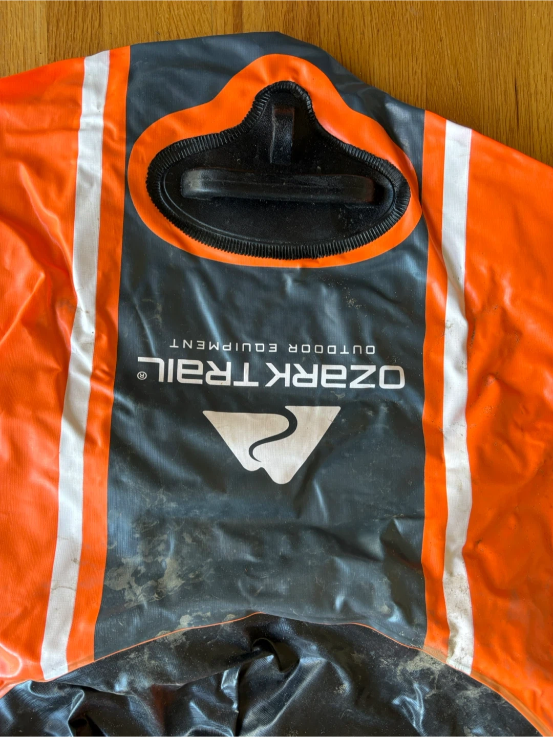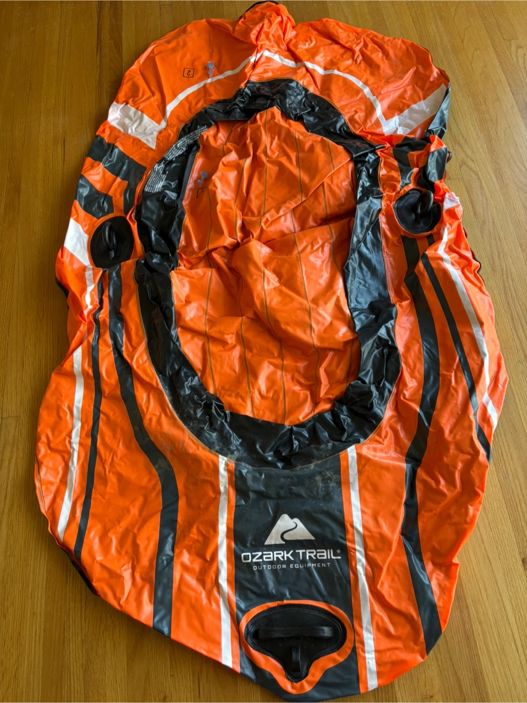 Selling an Ozark Trail inflatable water float! It's orange and black and looks like it can hold 1 adult and 1 child. Maximum weight capacity is 210 lbs (95 kg)
