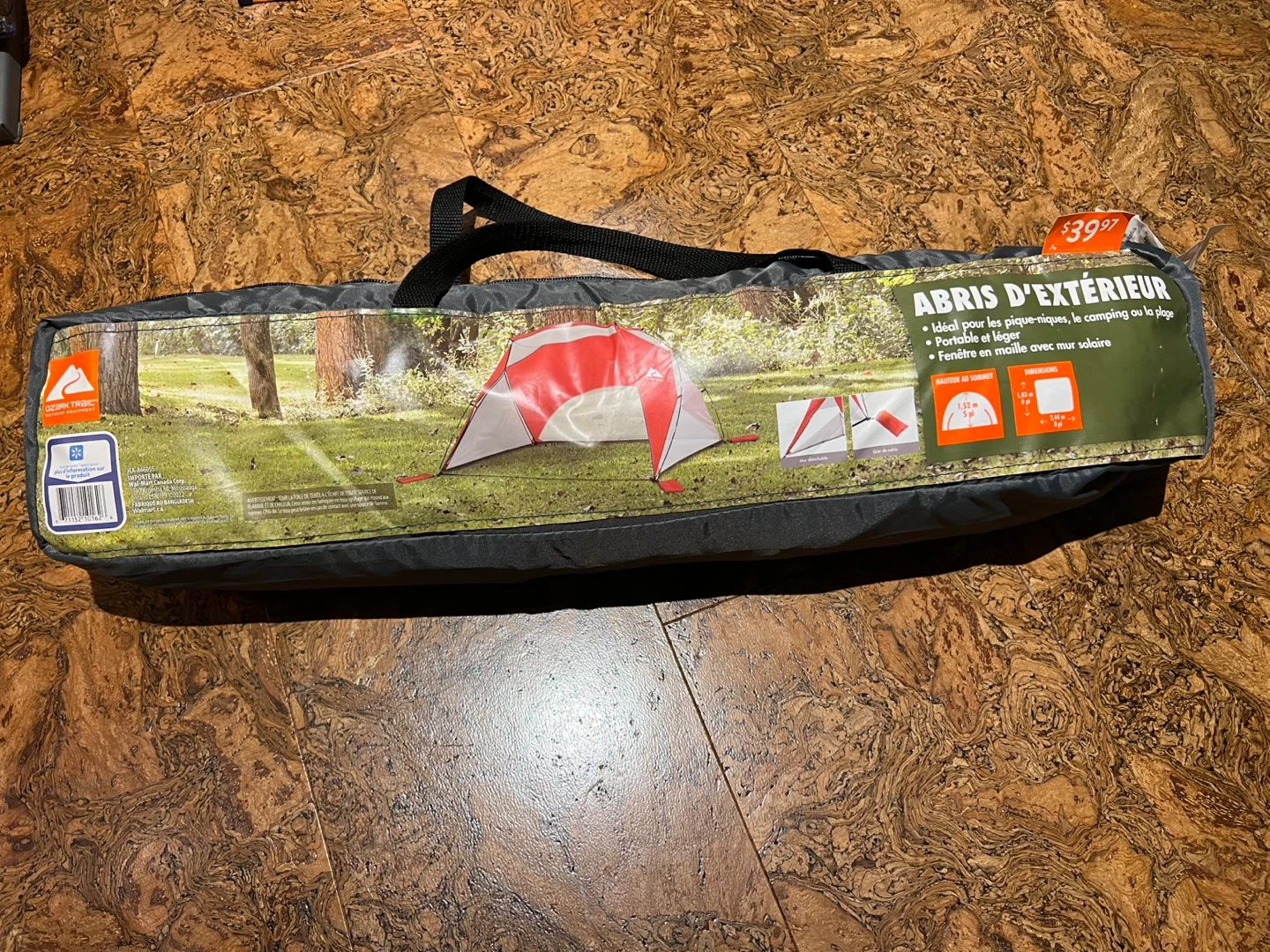 Selling an Ozark Trail shelter-tent. It's ideal for picnics, camping, or the beach. It is also portable and lightweight. It features a mesh window with a solar wall. Originally bought for $39.97.