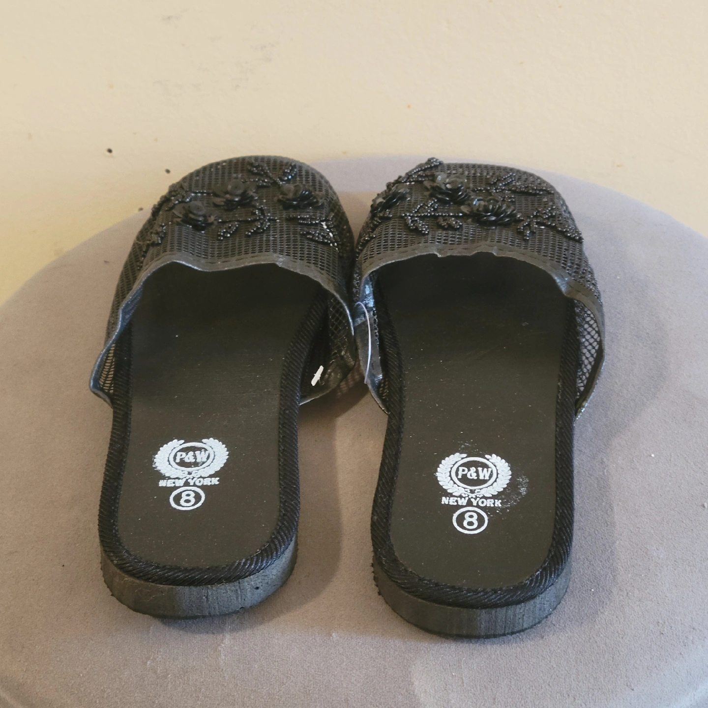 These are a pair of new, P&W New York black sandals in size 8. They feature a decorative design on the upper part of the sandal. Great for casual wear!