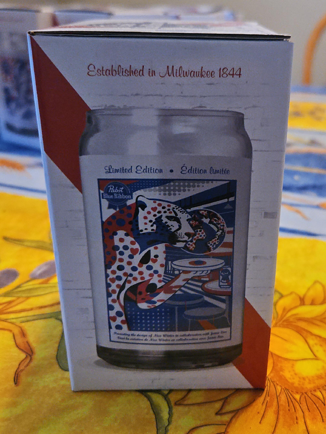Selling a limited edition Pabst Blue Ribbon can glass! It's brand new in the box. A cool piece for any beer enthusiast or collector of unique glassware. Image of large cat