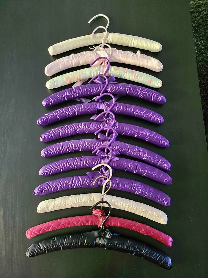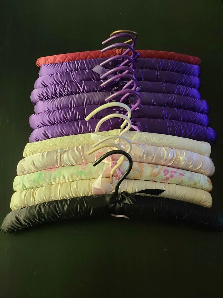 12 padded clothes hangers. Gentle satin is smooth and won't scratch or tear at the shoulders or edges of your clothing. Pick up near Lou's Grill in Abbotsford.