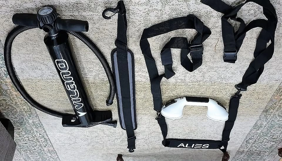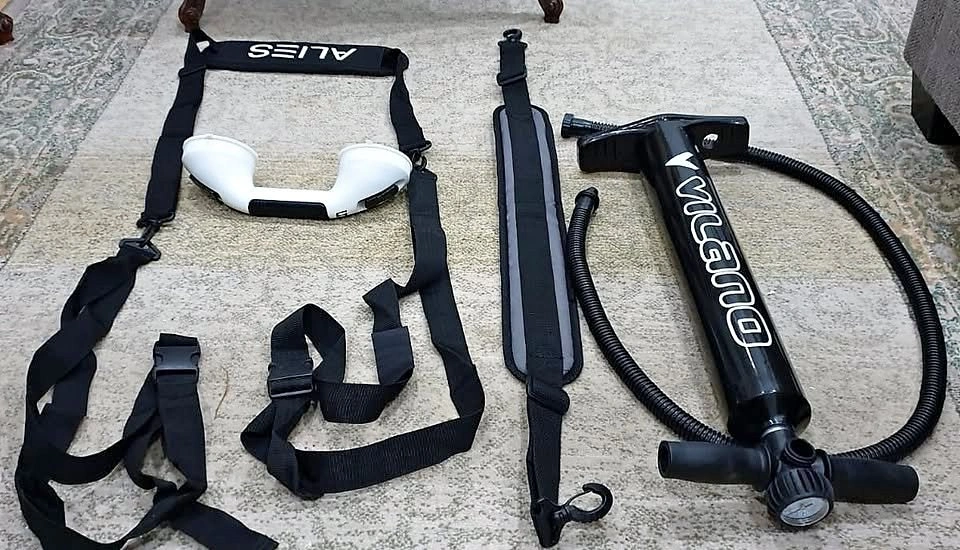 Paddle board accessories: Shoulder strap: Adjustable to your size and board. Wide shoulder pad for comfort. High-strength buckles. Pump: Vilano high pressure SUP pump, up to 27PSI. Double-action pump. Handle: SUPGrip suction cup carry handle. Attaches to your standup paddleboard.