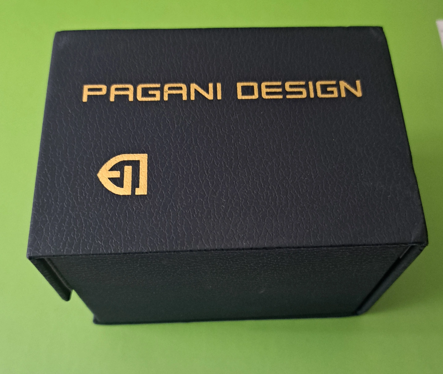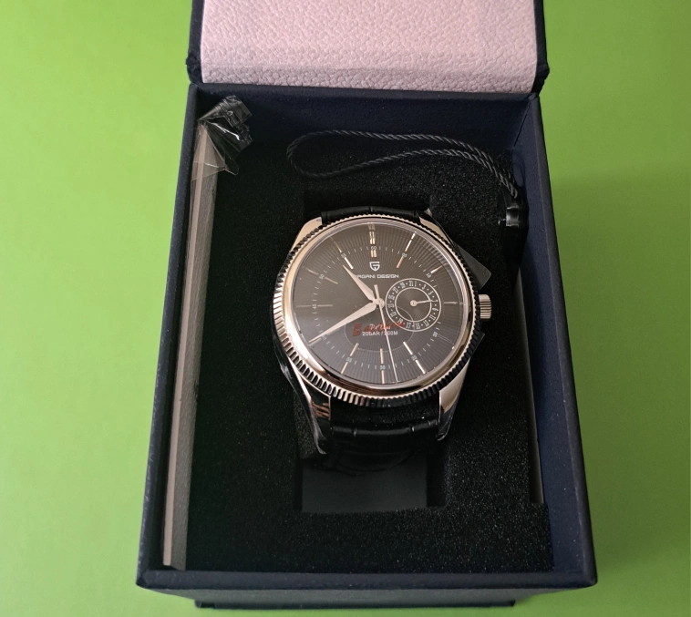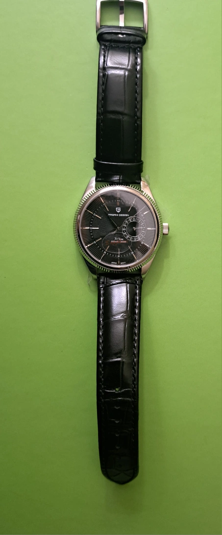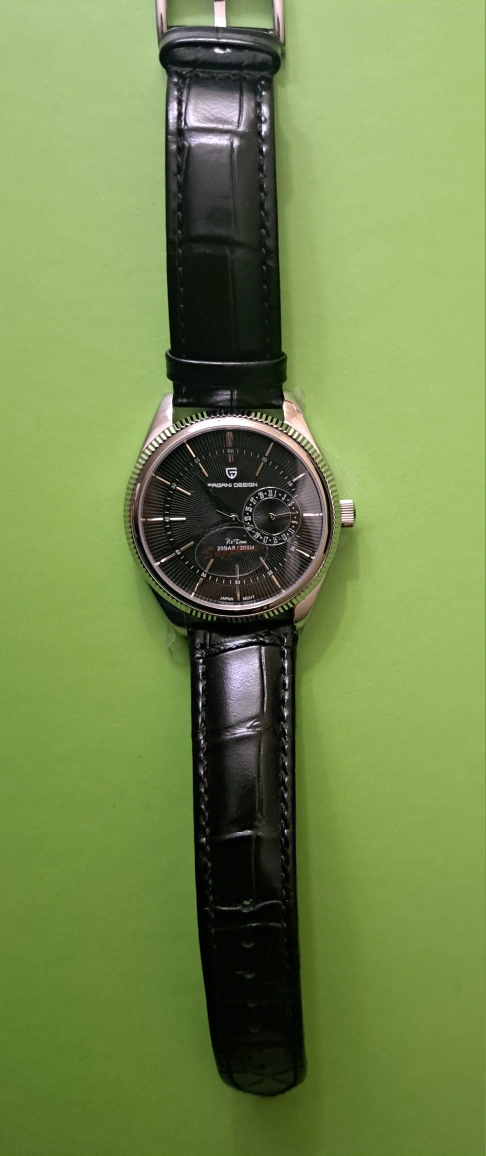 This is a beautiful Pagani Design men's watch with a black face and black leather band. It is a stylish and elegant watch that is sure to make a statement.