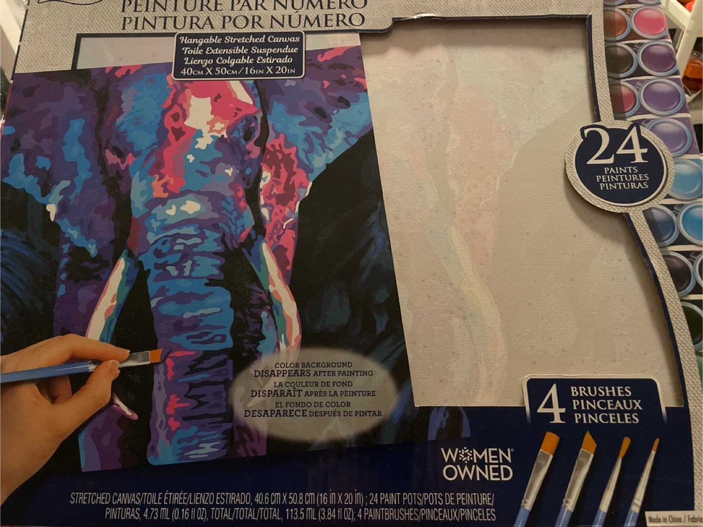 Get creative with this paint by numbers kit! It features a hangable stretched canvas with an elephant design. The canvas size is 40cm x 50cm (16in x 20in). The kit includes 24 paints and 4 brushes. The color background disappears after painting