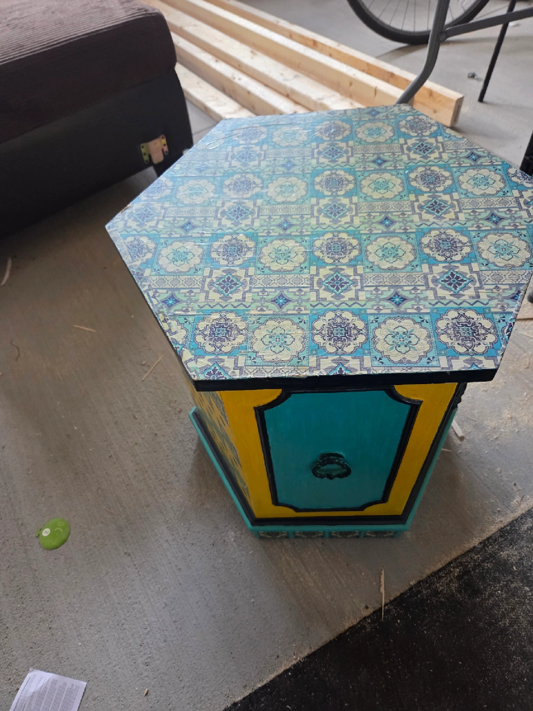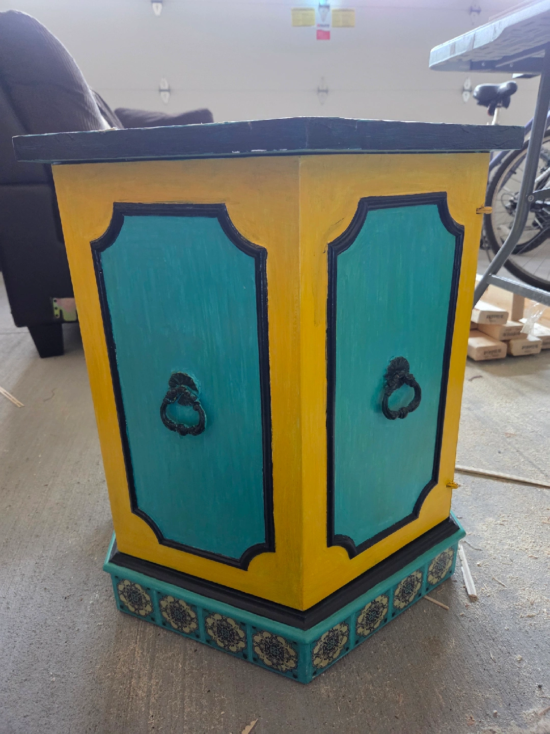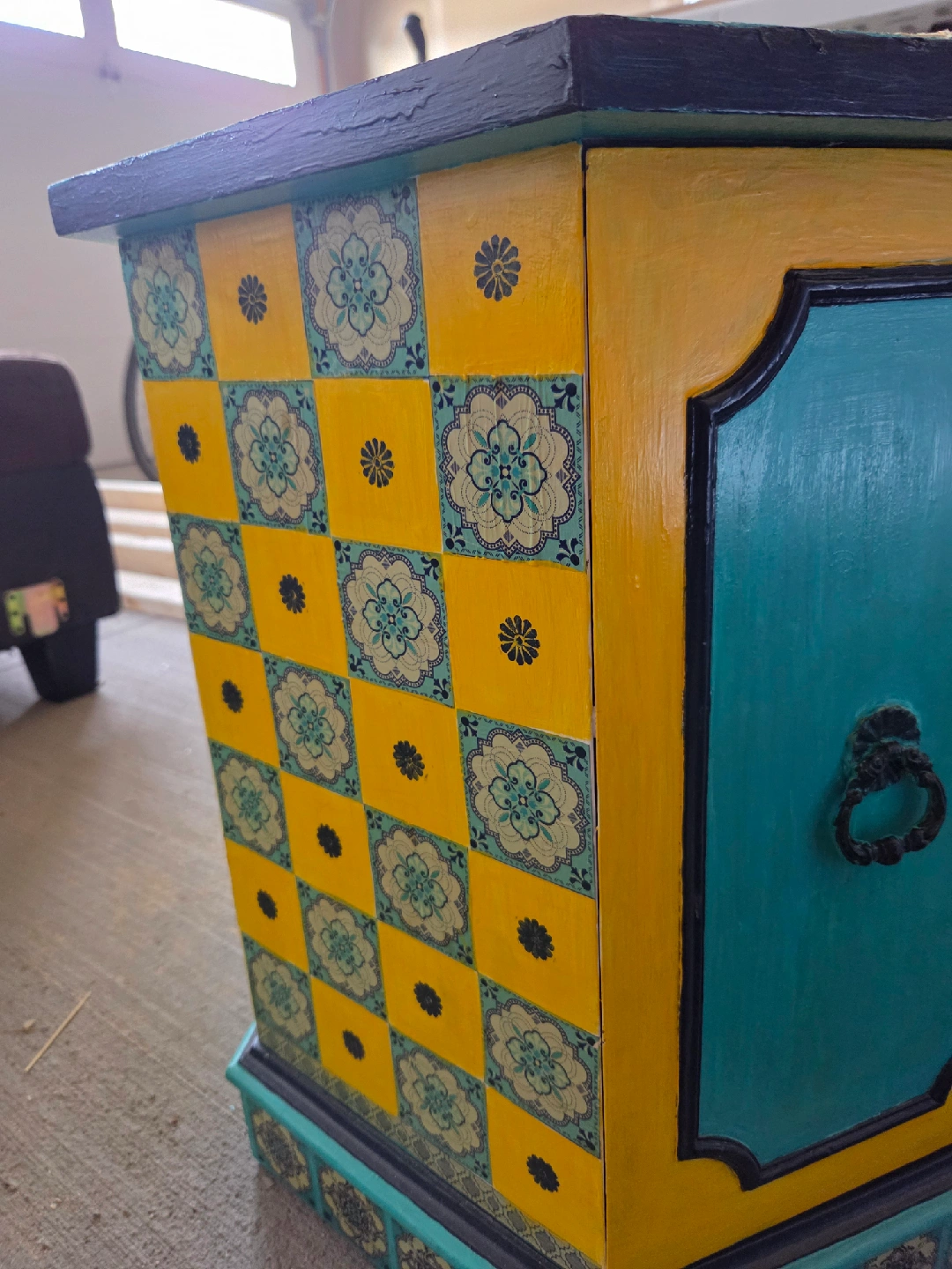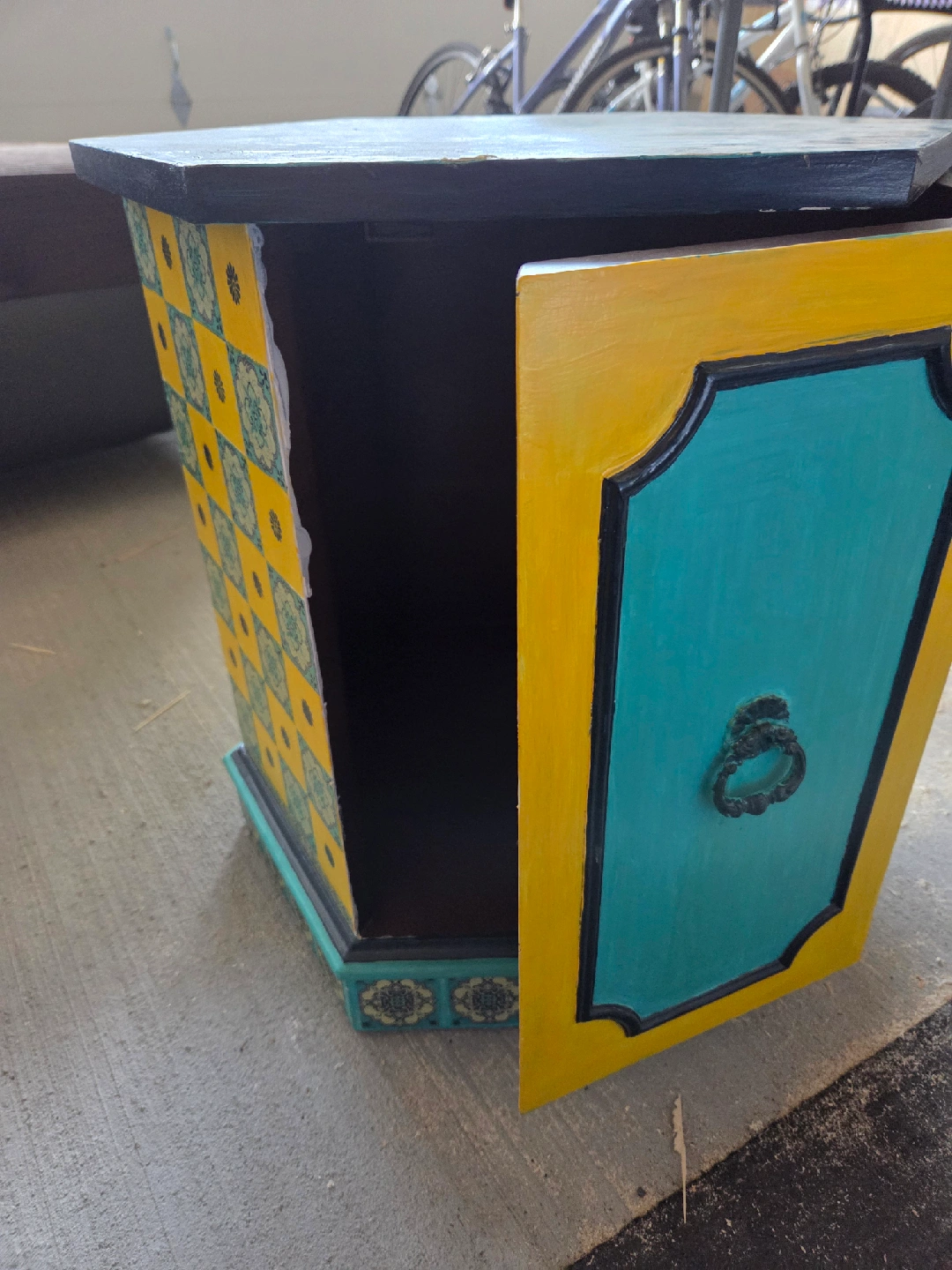 Unique painted accent table with a bright and cheerful design! It features yellow and teal panels with decorative hardware. The top has a lovely tile-like pattern. Perfect for adding a pop of colour to any room!