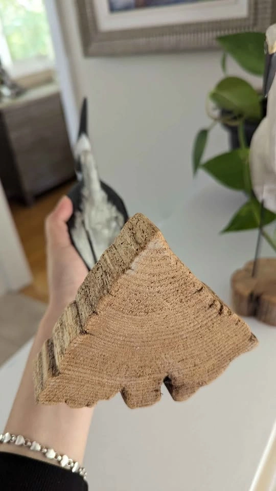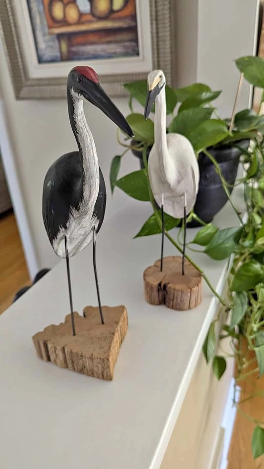 Vintage hand-carved wooden bird sculptures from The Painted Bird collection by Connecticut artist Richard A. Morgan, signed RAM©88 on the underside. Each features elegant craftsmanship with painted detailing and mounted on natural wood bases. $60 each or $100 for both. View his collection here: thepaintedbird.net https://thebarringtongarage.com/collections/the-painted-bird-carved-decoys-by-richard-morgan