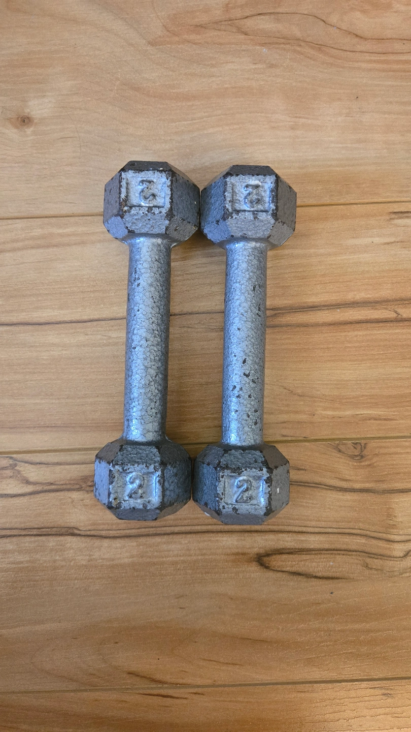 Two 2kg hexagonal dumbbells. Grey metal finish. Good for home workouts. Pick up only Cash only Please check out my other listings :)