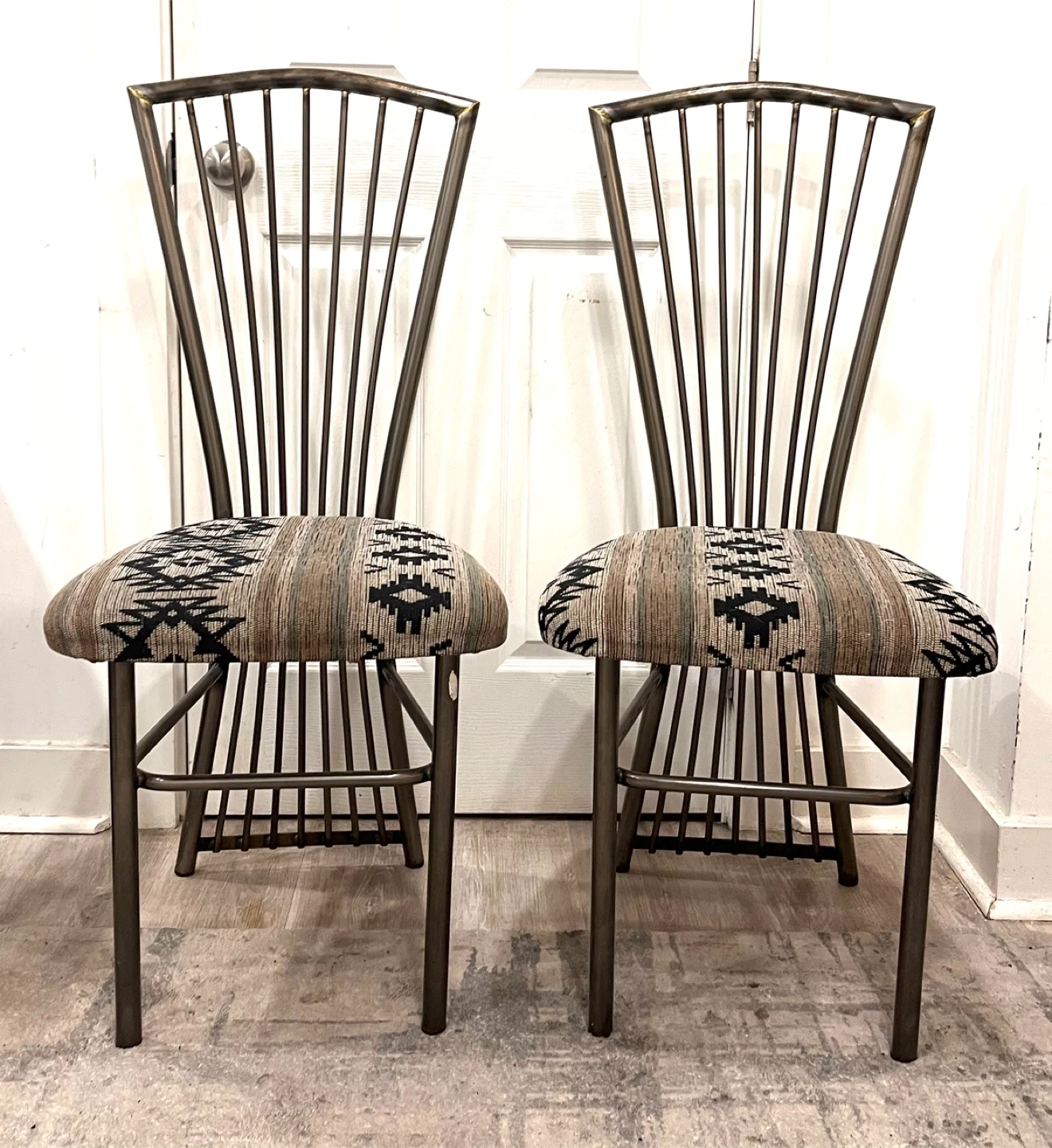 Selling a pair of accent chairs! They have a unique patterned seat and a stylish metal frame. These chairs would be a great addition to any living room or dining area. They're in good condition and ready for a new home!