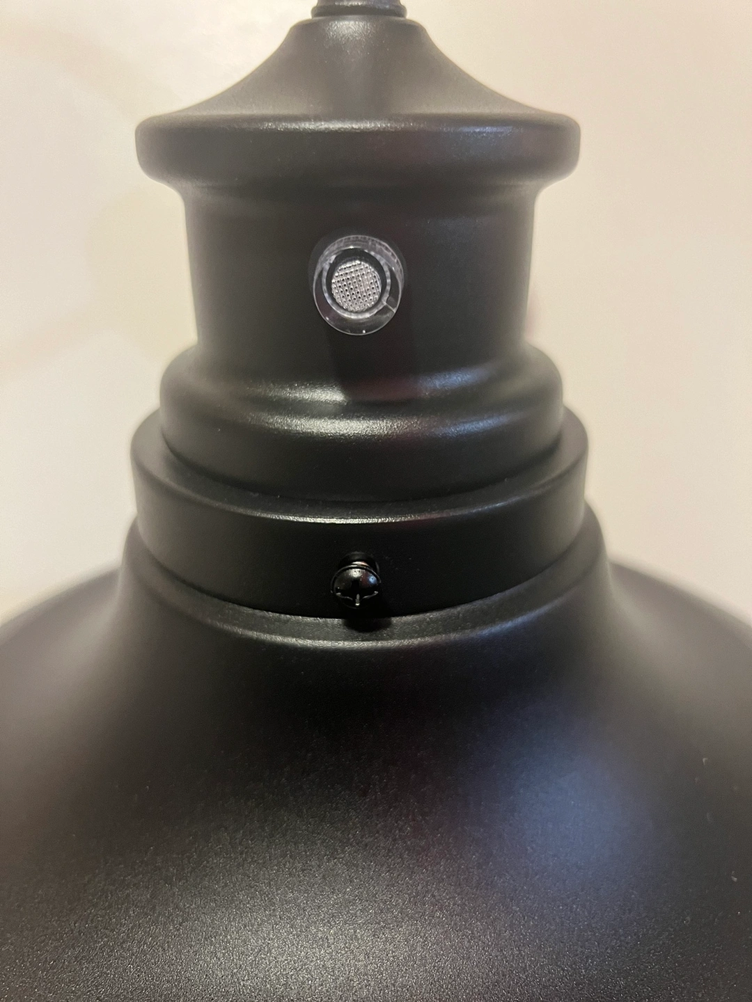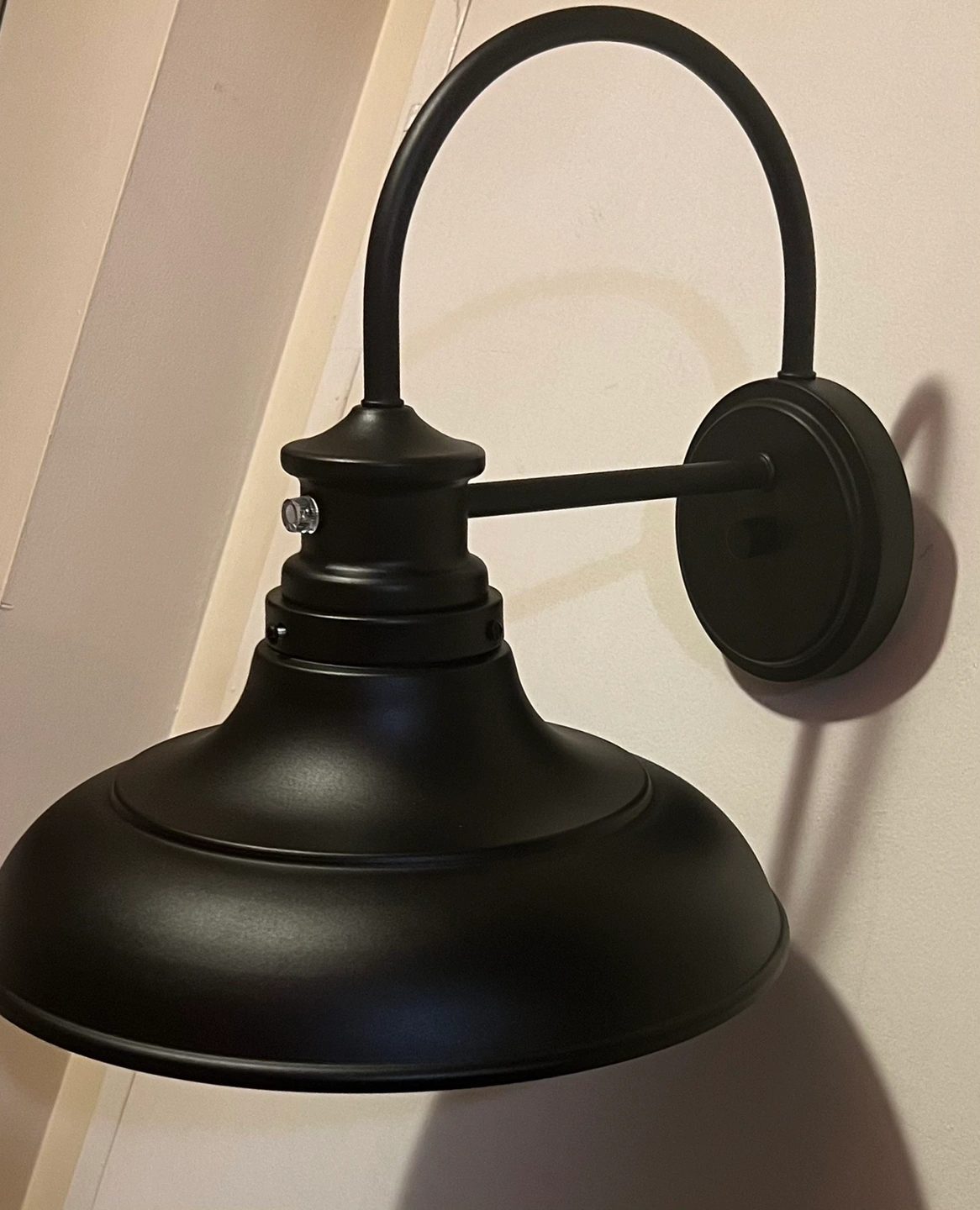 TWO • Motion detected black wall sconces with a curved arms and a 14” shades. They use very bright built in LED light. Will not have to change light bulbs!! Comes with cap to cover motion detecter if you just want them to turn off and on with switch in home. They are brand new in box just opened to check out the side in space. Just not the right fit for the project went with smaller ones and did not return in time.
