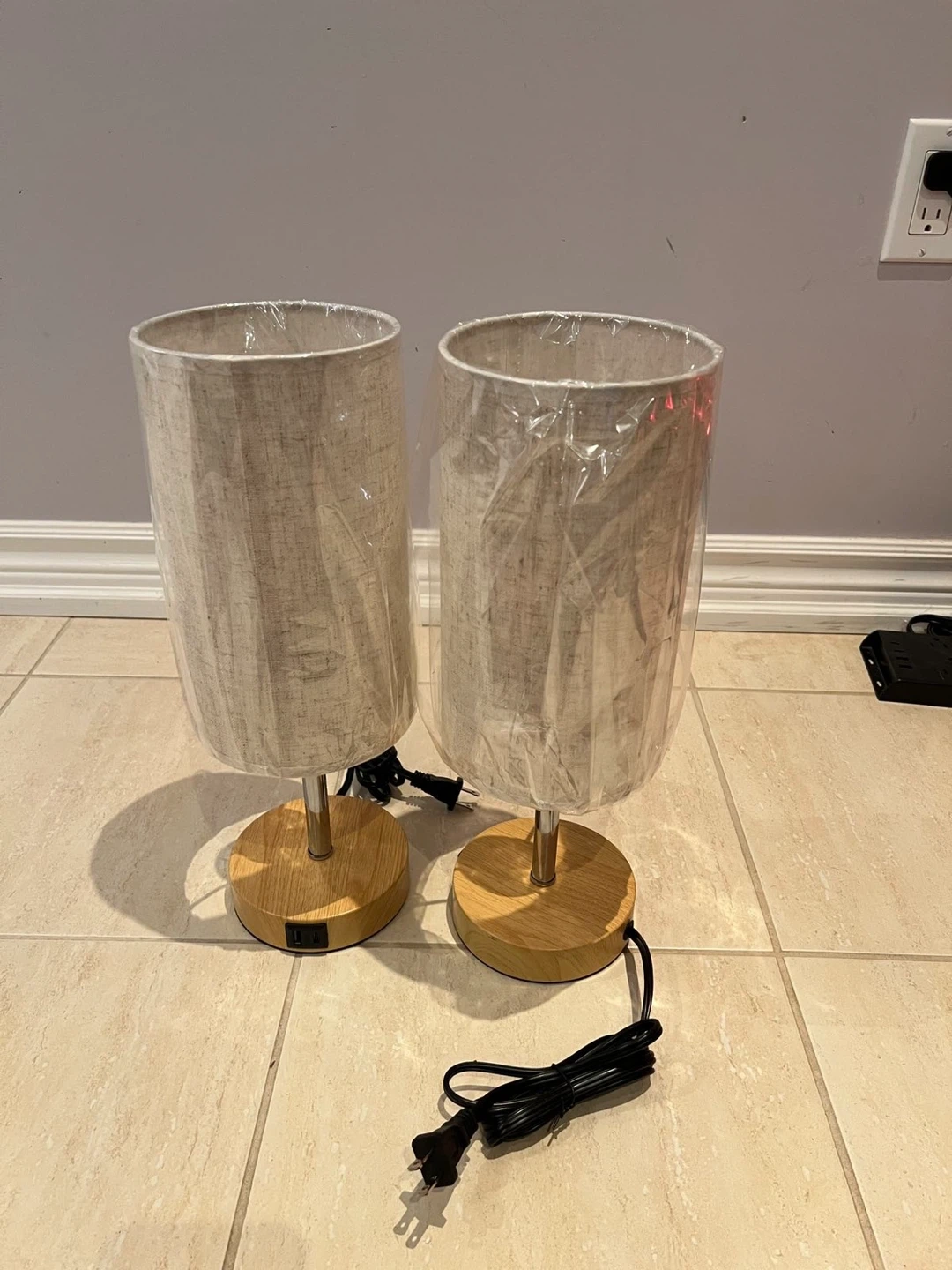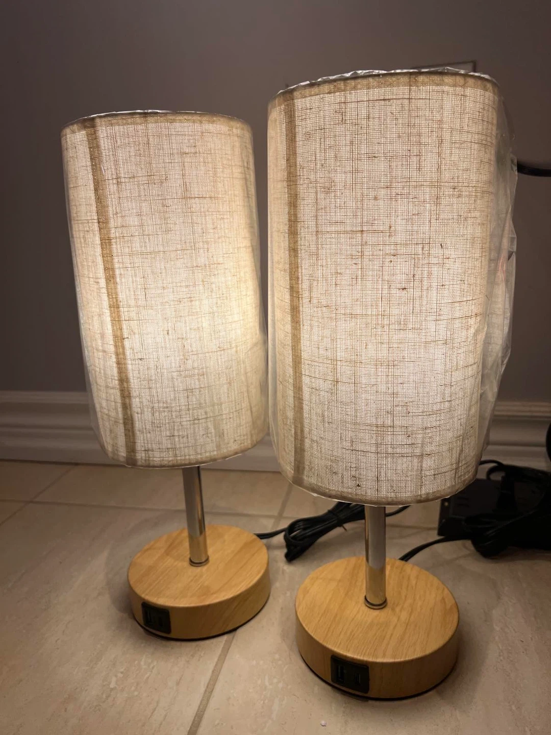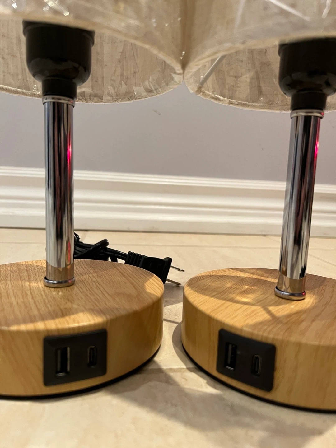 Selling a pair of bedside lamps! They have a wooden base and a light beige shade. Each lamp also has a USB and USB-C port built into the base, which is super handy for charging your devices overnight. They're in great shape and come with lightbulbs