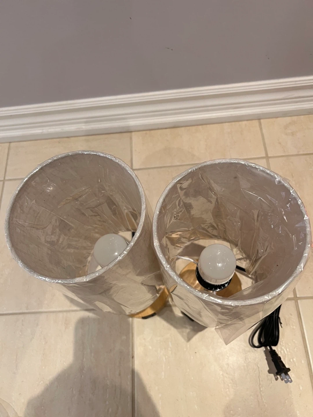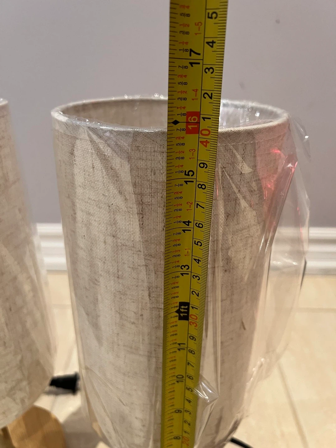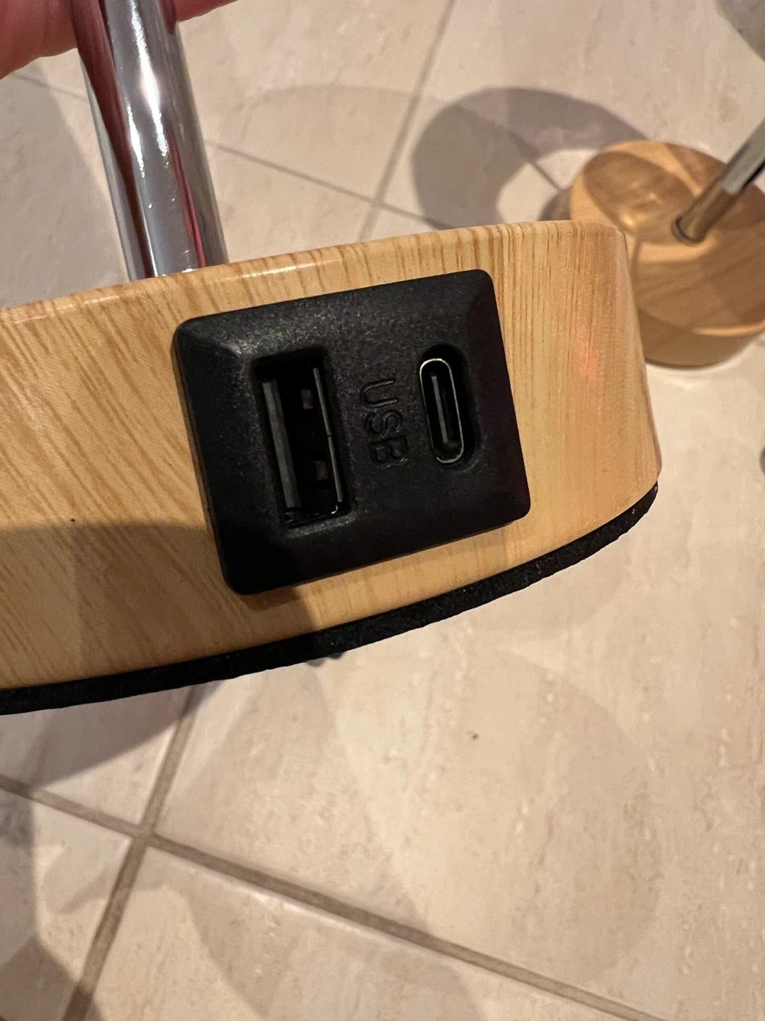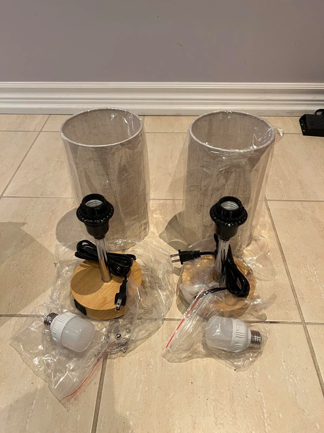 Selling a pair of bedside lamps! They have a wooden base and a light beige shade. Each lamp also has a USB and USB-C port built into the base, which is super handy for charging your devices overnight. They're in great shape and come with lightbulbs